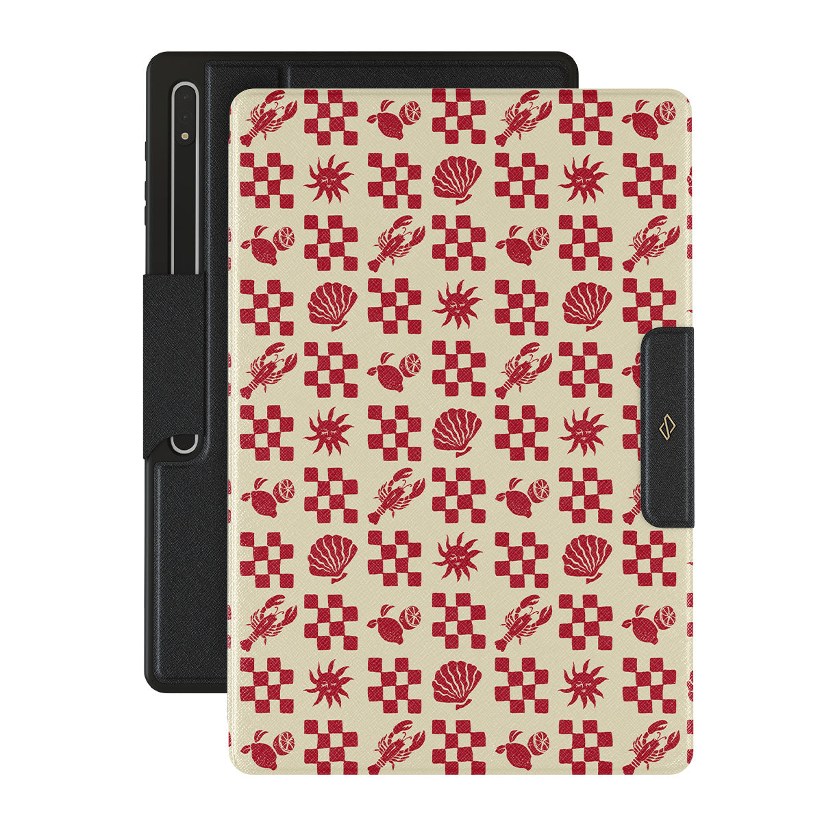 此設計特色:紅色格紋圖案、貝殼、龍蝦、義大利元素