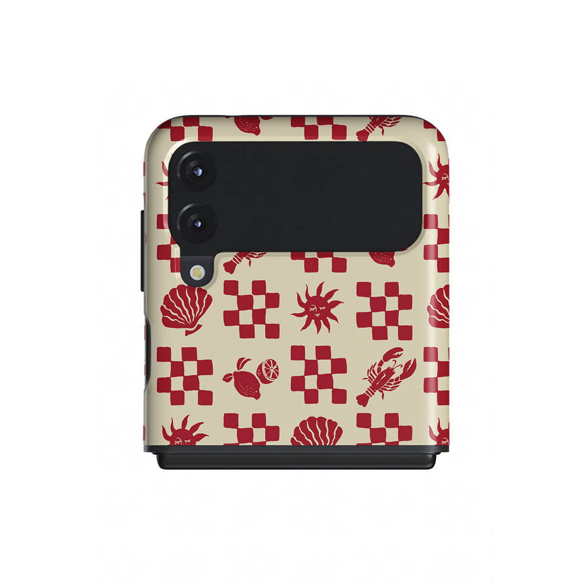 此設計特色:紅色格紋圖案、貝殼、龍蝦、義大利元素