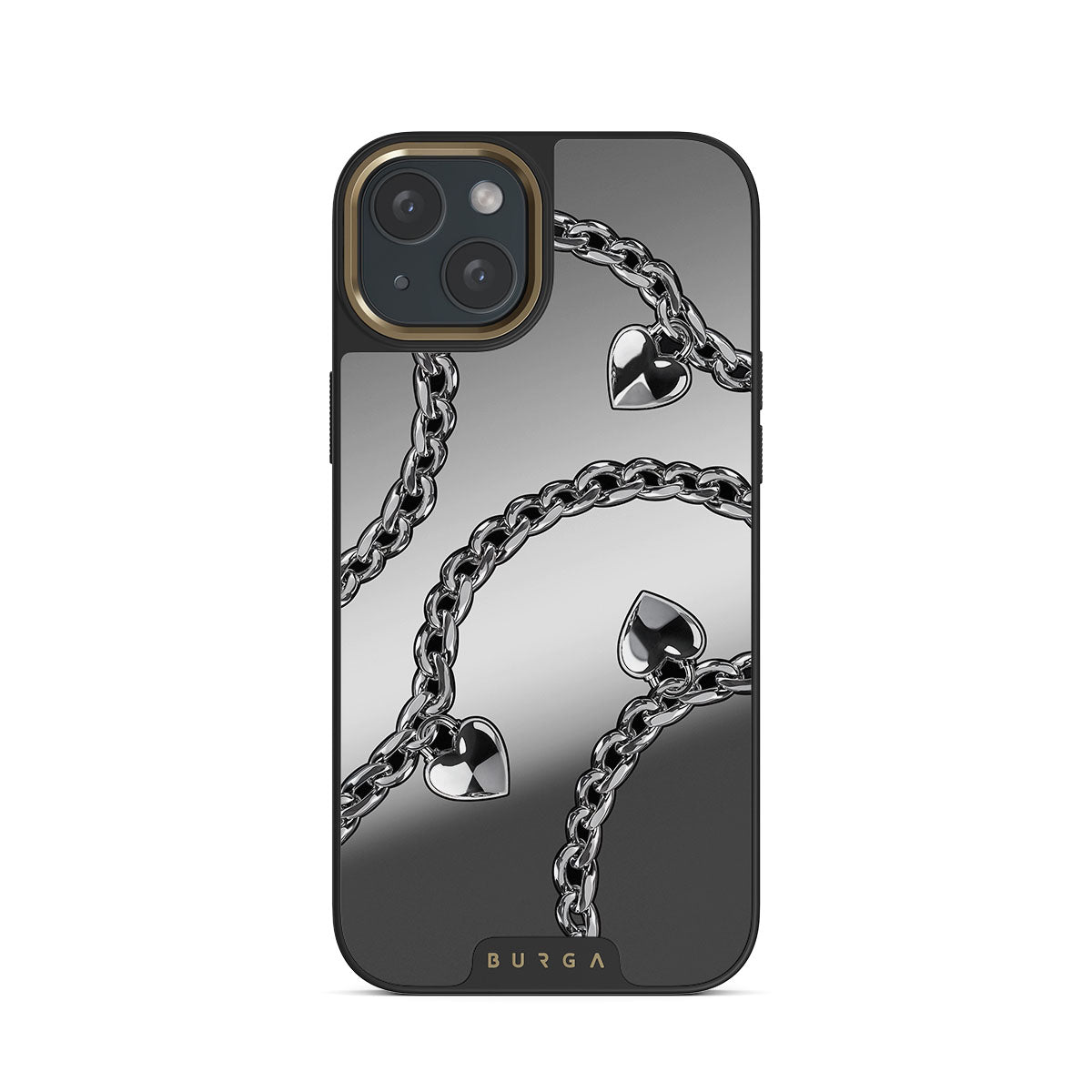 此設計特色:鍊條、心形、銀色、金屬細節、鏡面