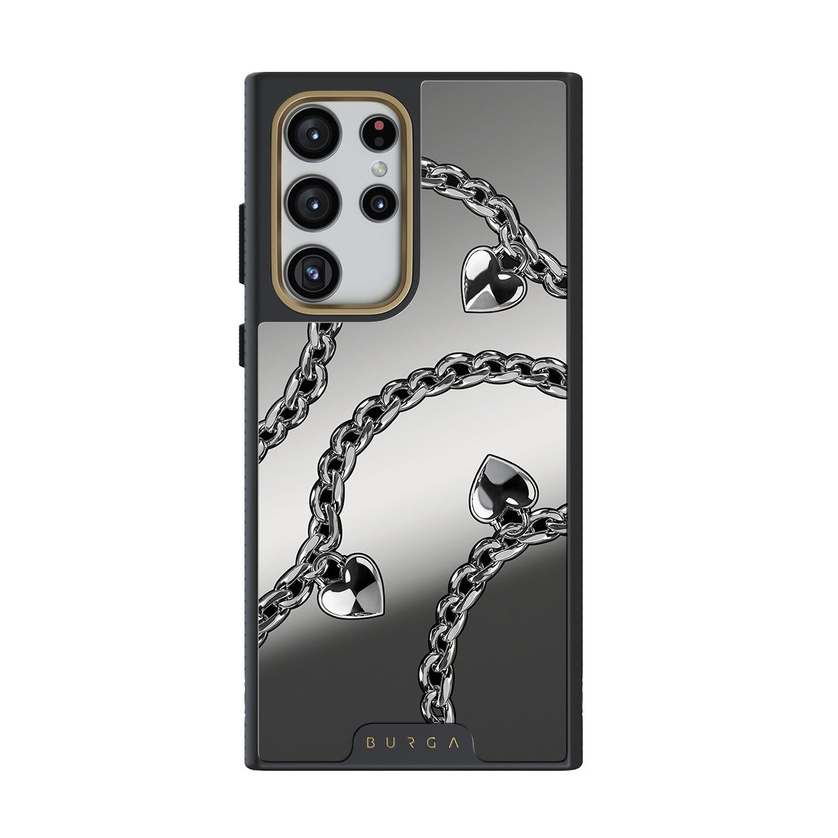 此設計特色:鍊條、心形、銀色、金屬細節、鏡面