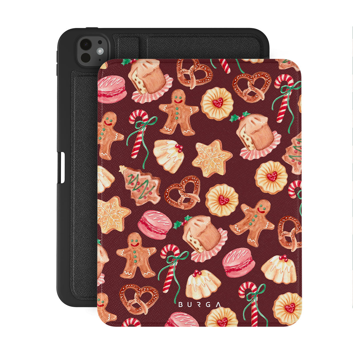此設計特色:聖誕餅乾,薑餅人,糖果杖,薄荷糖果,節日甜點,酒紅色背景