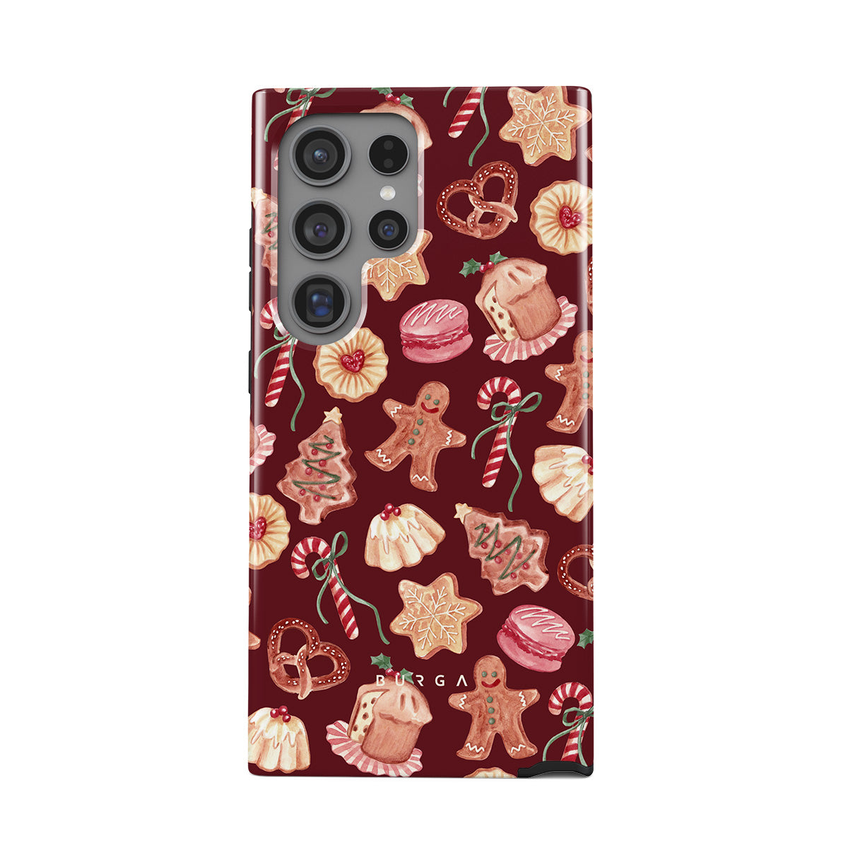 此設計特色:聖誕餅乾,薑餅人,糖果杖,薄荷糖果,節日甜點,酒紅色背景