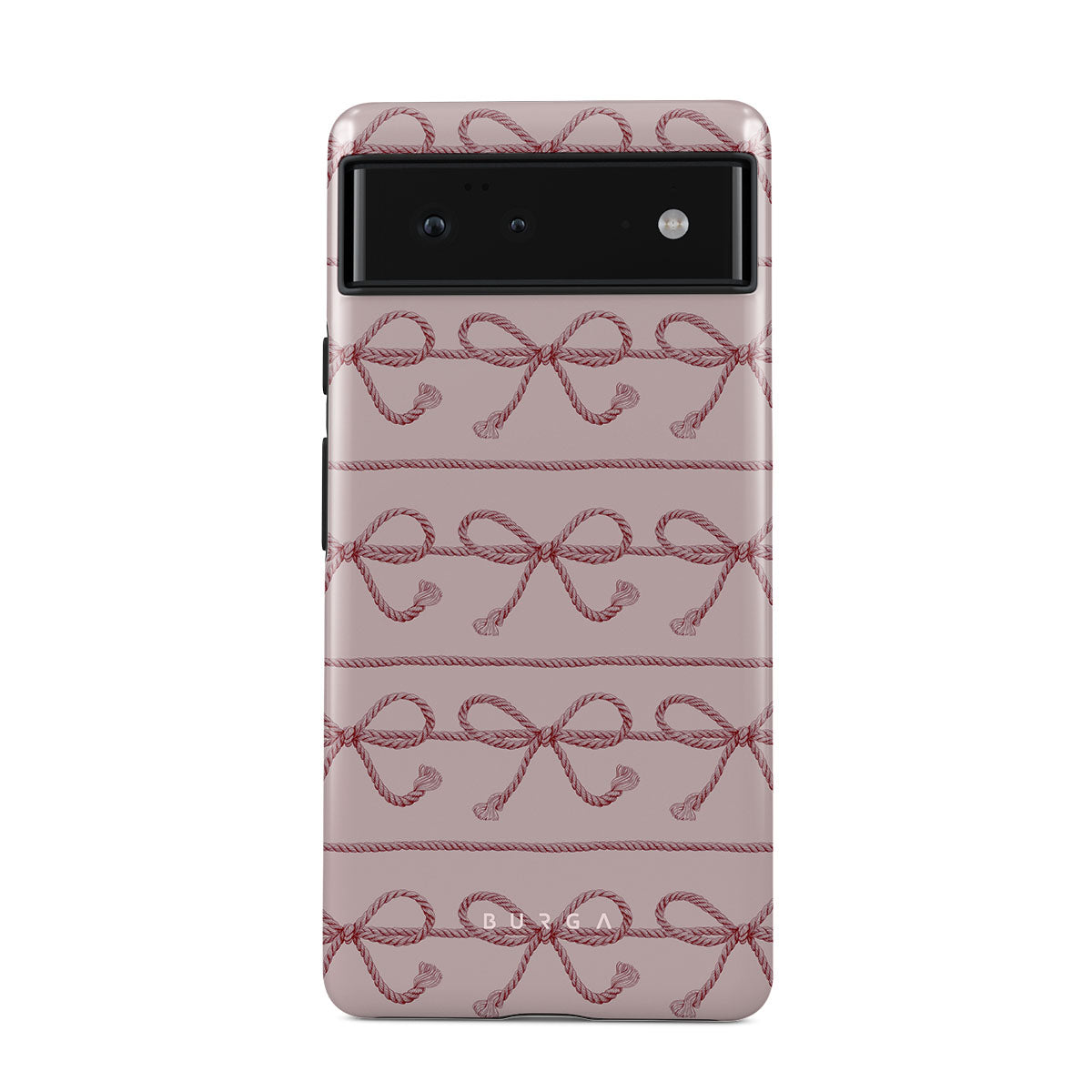 這款手機殼的設計包括粉色蝴蝶結、粉色背景、繩索元素和俏皮的印花。