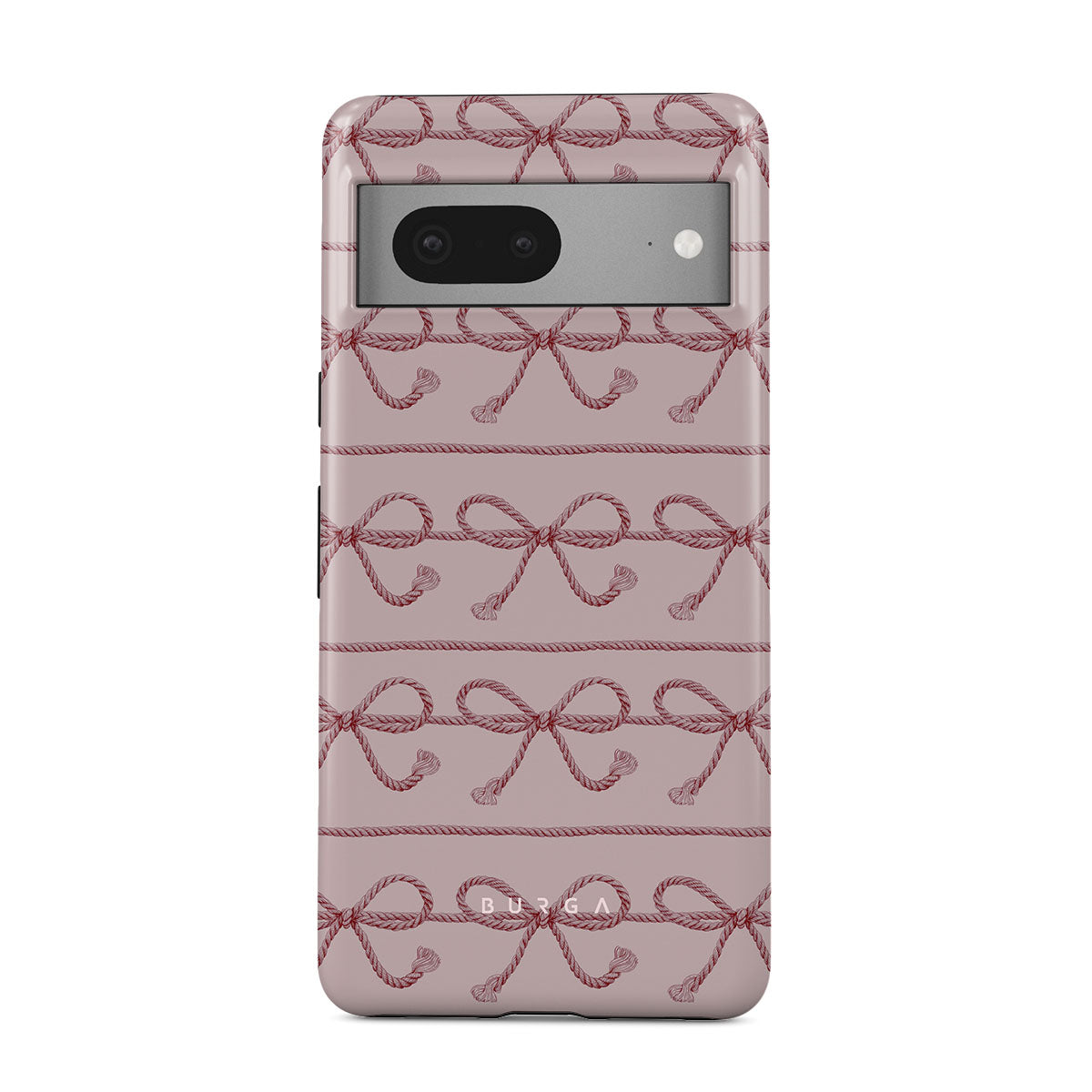 這款手機殼的設計包括粉色蝴蝶結、粉色背景、繩索元素和俏皮的印花。
