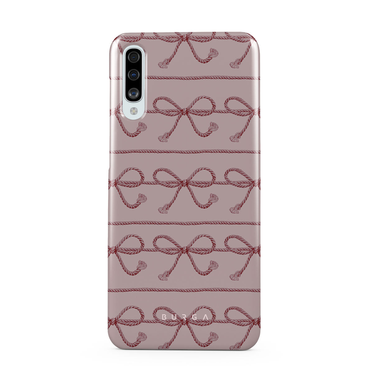 這款手機殼的設計包括粉色蝴蝶結、粉色背景、繩索元素和俏皮的印花。