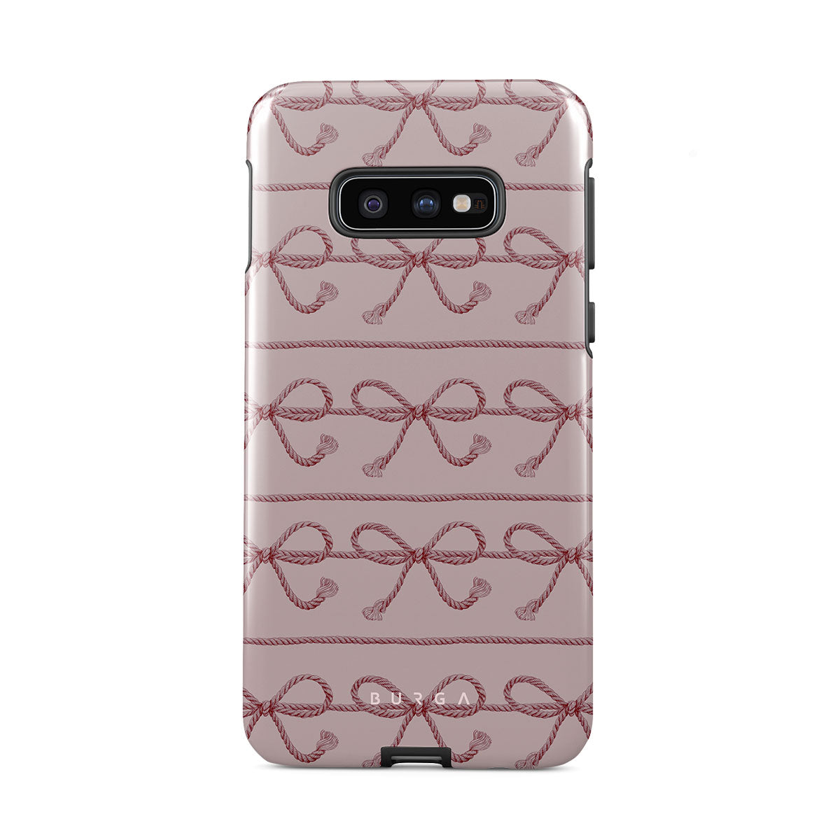 這款手機殼的設計包括粉色蝴蝶結、粉色背景、繩索元素和俏皮的印花。