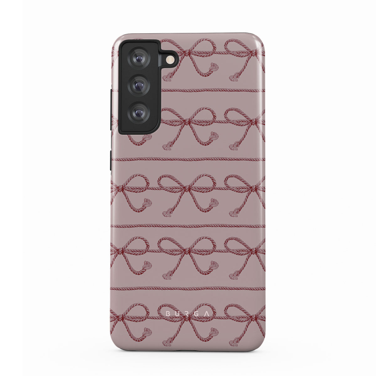 這款手機殼的設計包括粉色蝴蝶結、粉色背景、繩索元素和俏皮的印花。