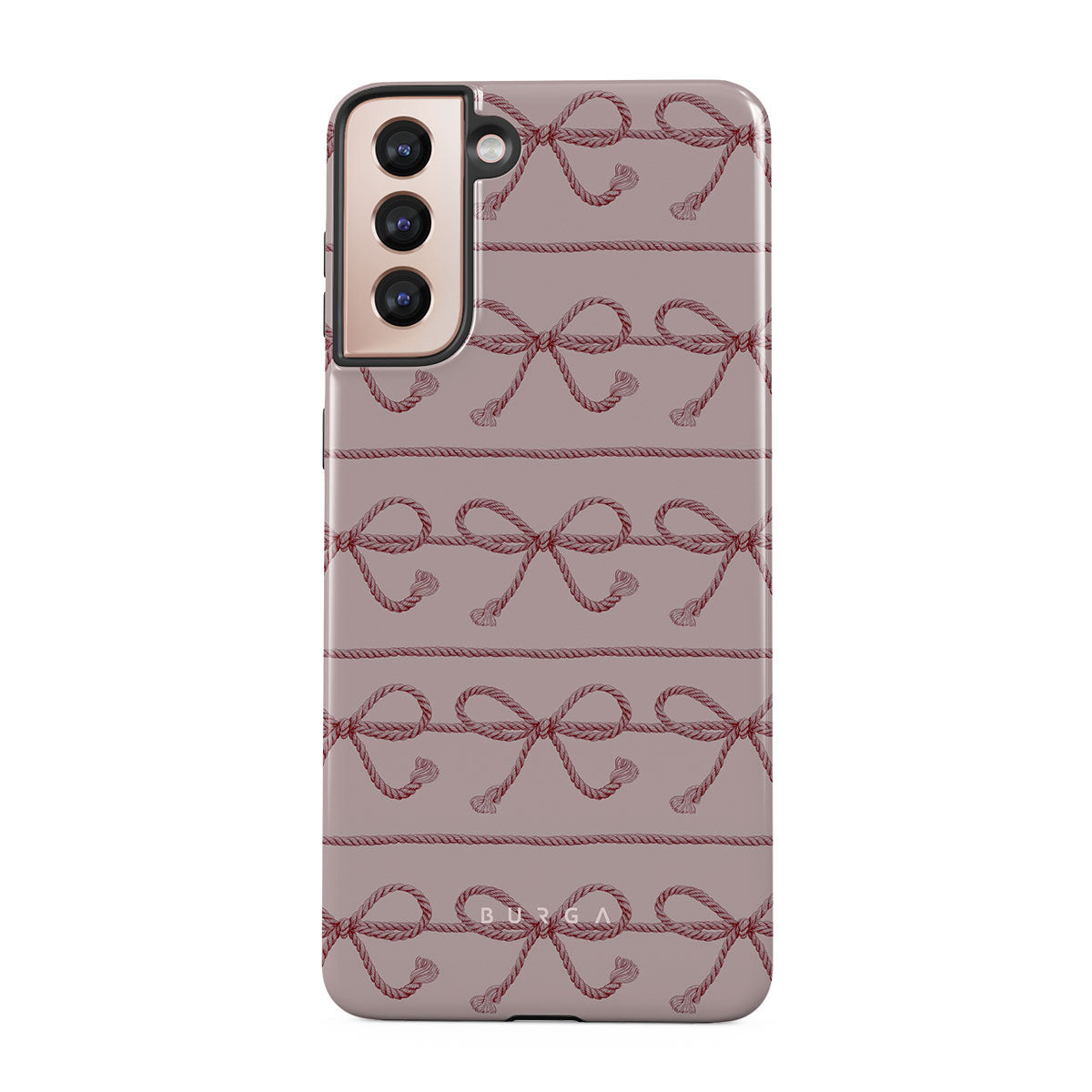 這款手機殼的設計包括粉色蝴蝶結、粉色背景、繩索元素和俏皮的印花。