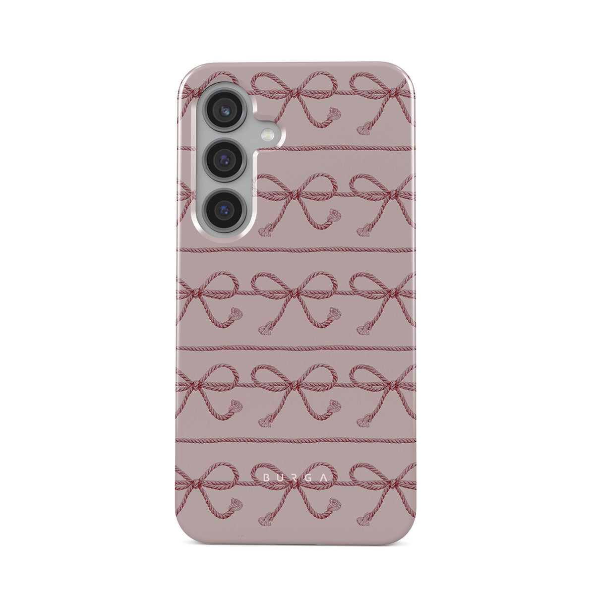 這款手機殼的設計包括粉色蝴蝶結、粉色背景、繩索元素和俏皮的印花。