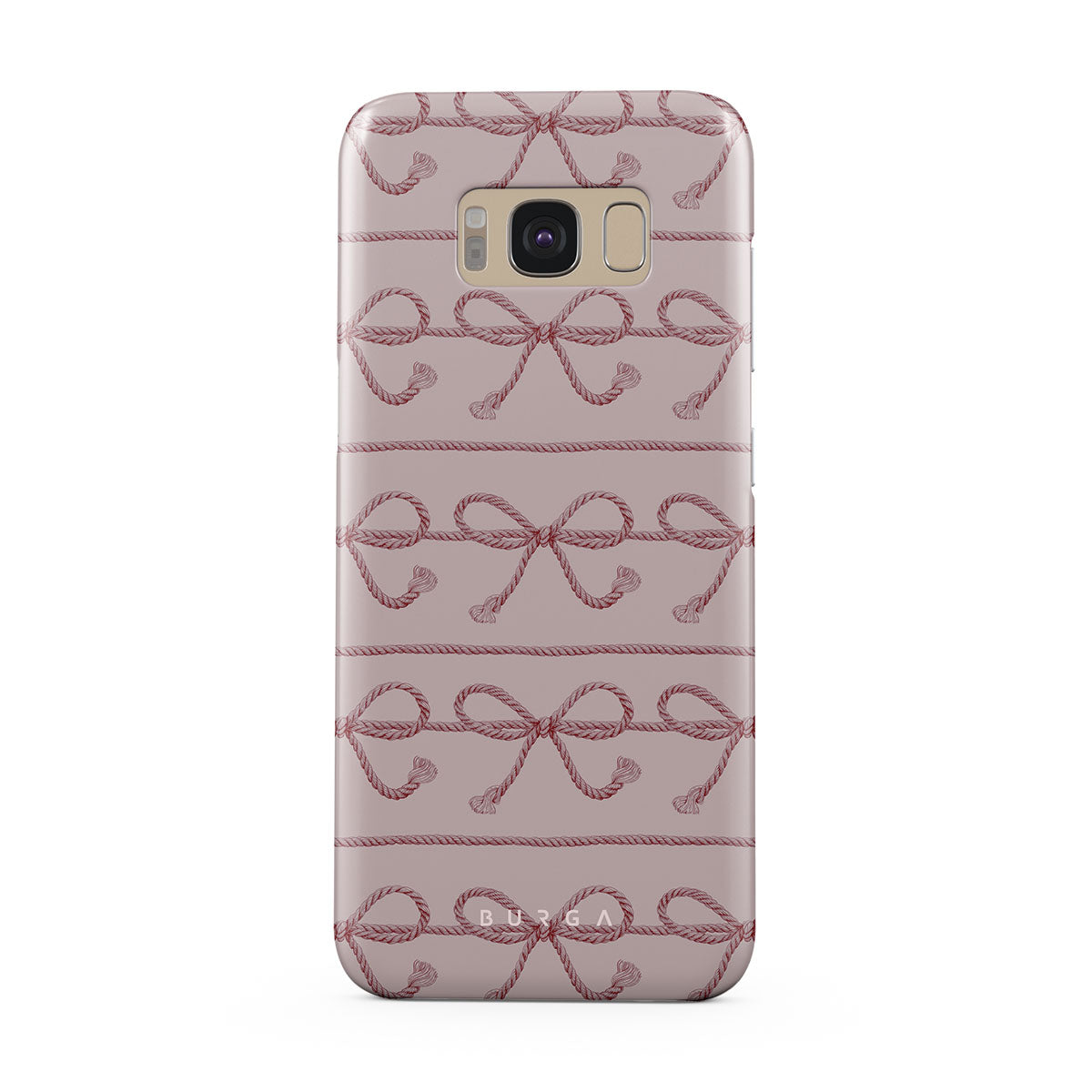 這款手機殼的設計包括粉色蝴蝶結、粉色背景、繩索元素和俏皮的印花。