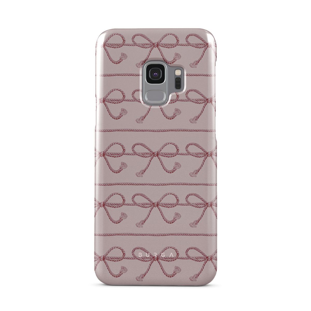 這款手機殼的設計包括粉色蝴蝶結、粉色背景、繩索元素和俏皮的印花。