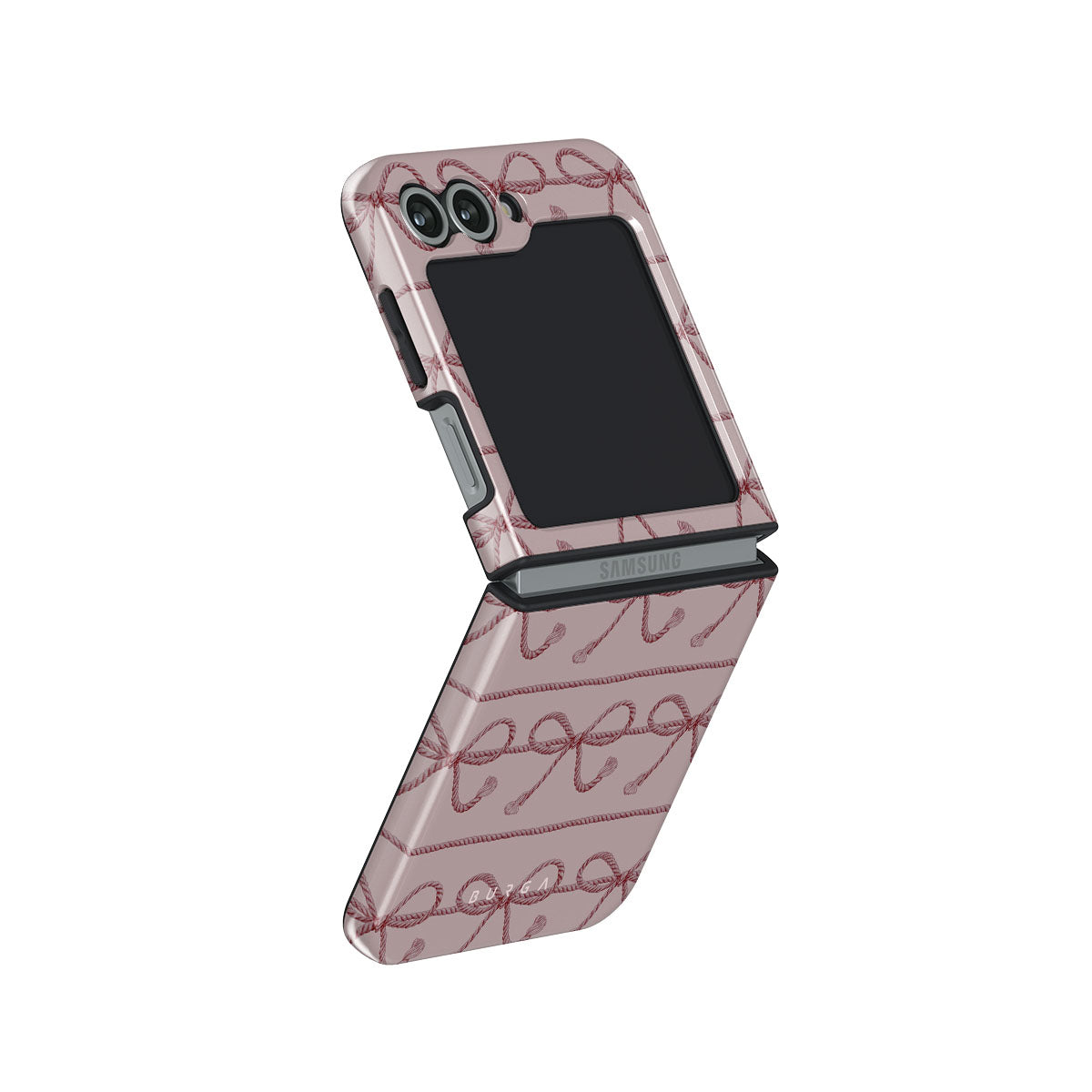 這款手機殼的設計包括粉色蝴蝶結、粉色背景、繩索元素和俏皮的印花。