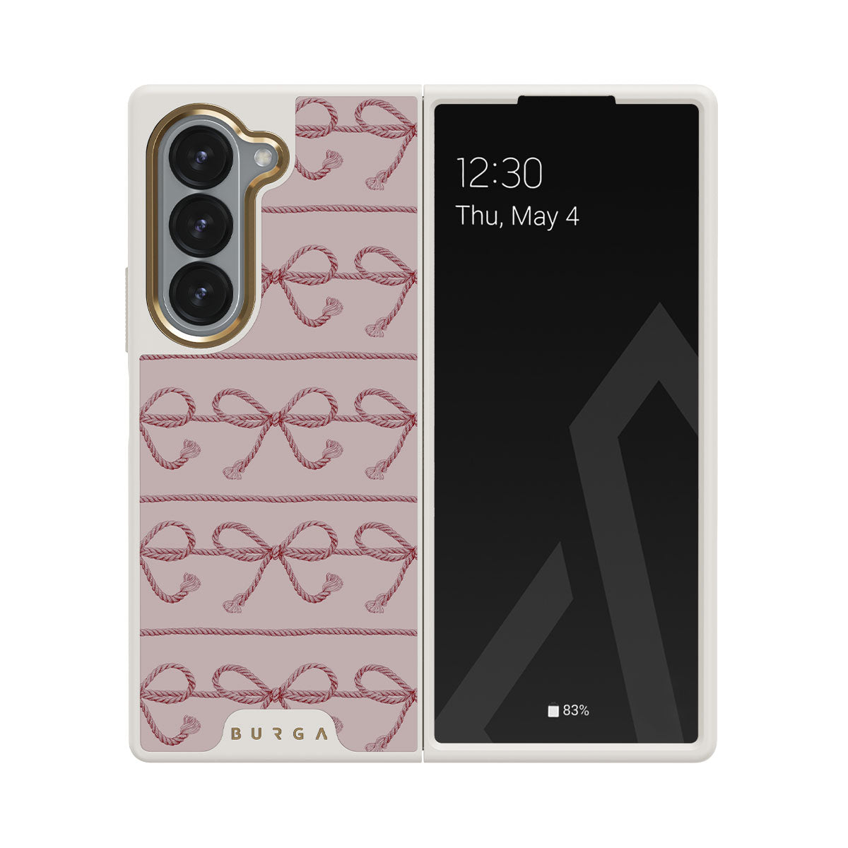 這款手機殼的設計包括粉色蝴蝶結、粉色背景、繩索元素和俏皮的印花。