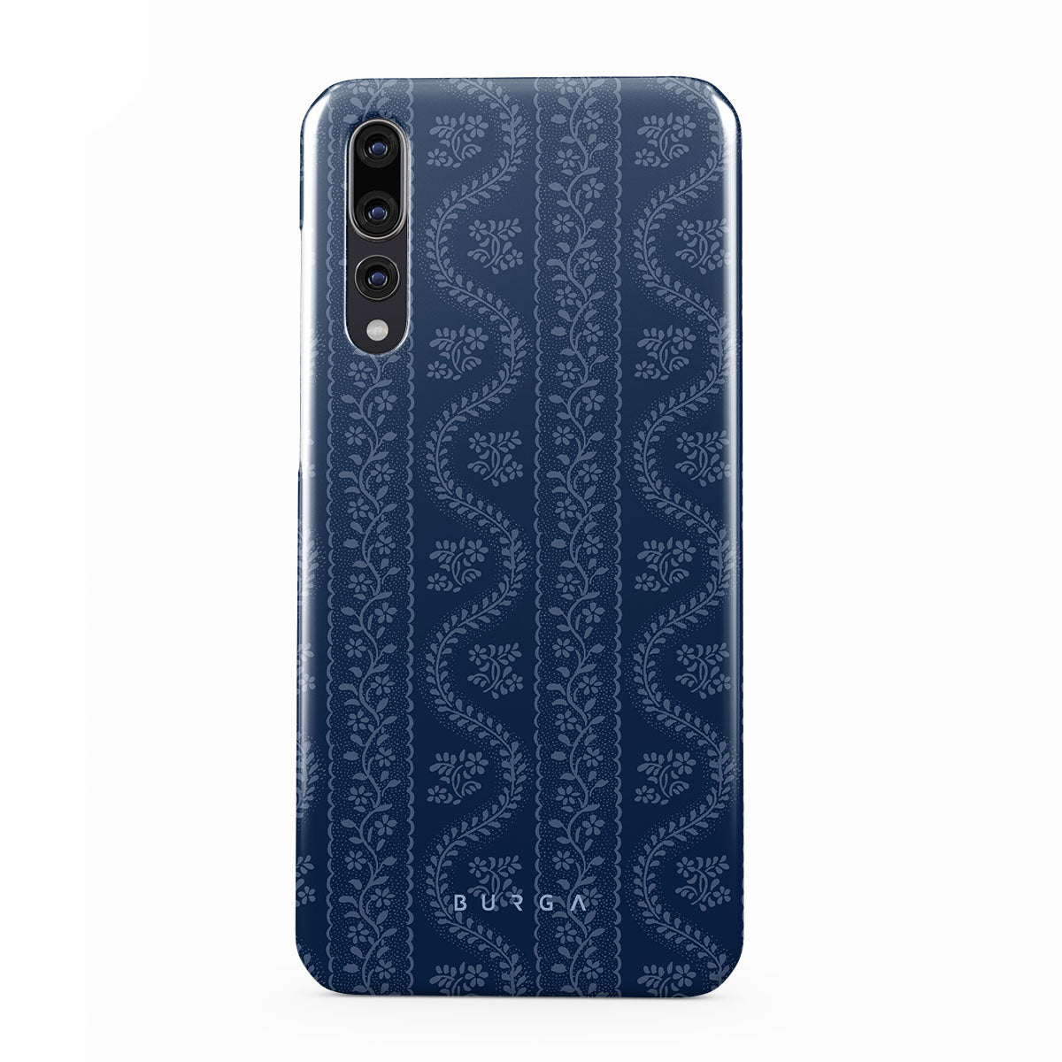 這款手機殼設計採用了佩斯里、仿牛仔布、復古懷舊、經典款式、繁複花紋和藍色系的印花。
