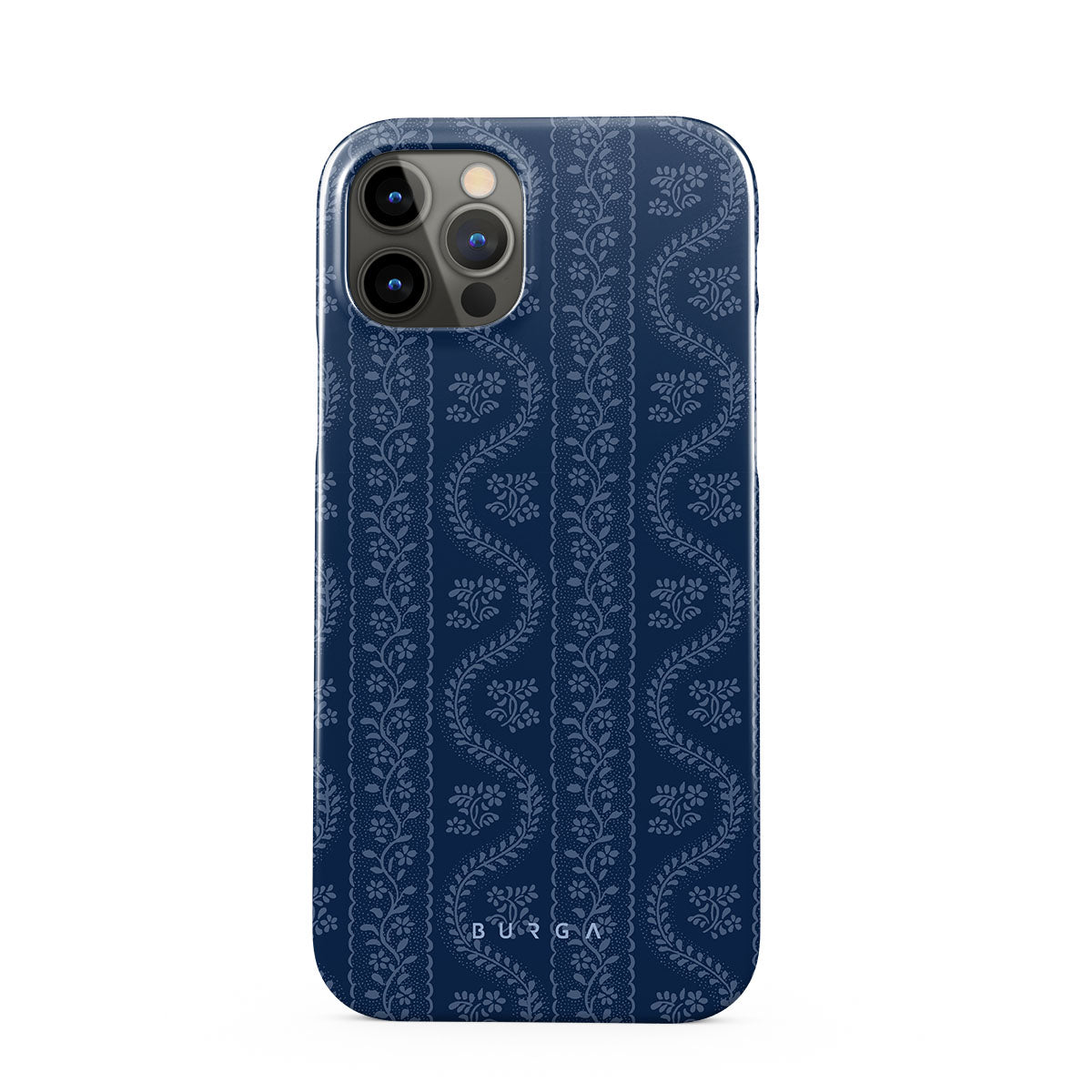 這款手機殼設計採用了佩斯里、仿牛仔布、復古懷舊、經典款式、繁複花紋和藍色系的印花。