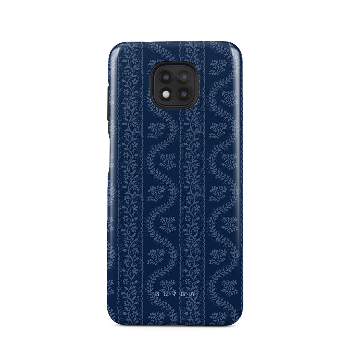 這款手機殼設計採用了佩斯里、仿牛仔布、復古懷舊、經典款式、繁複花紋和藍色系的印花。