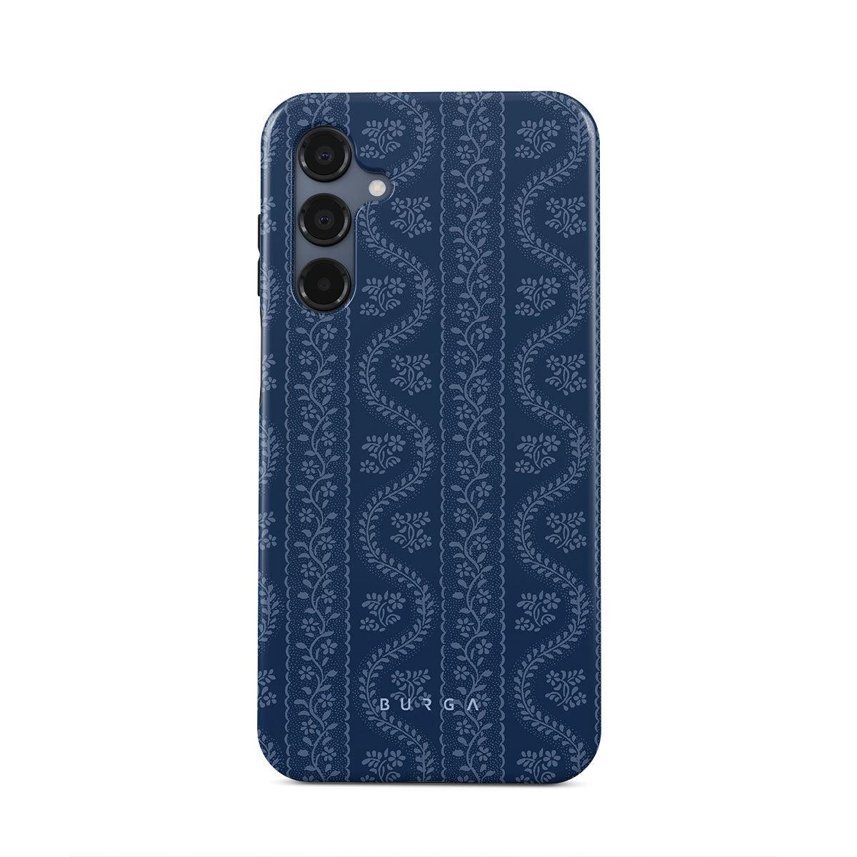 這款手機殼設計採用了佩斯里、仿牛仔布、復古懷舊、經典款式、繁複花紋和藍色系的印花。