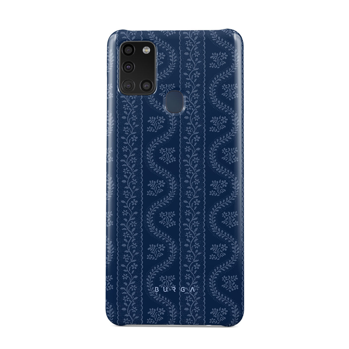這款手機殼設計採用了佩斯里、仿牛仔布、復古懷舊、經典款式、繁複花紋和藍色系的印花。