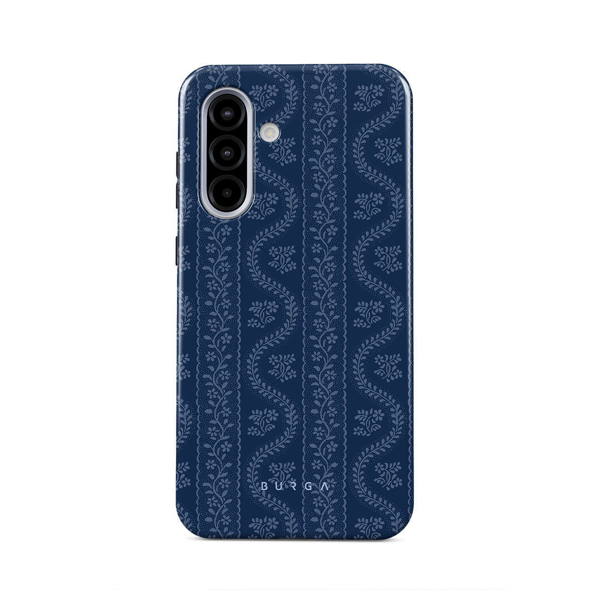 這款手機殼設計採用了佩斯里、仿牛仔布、復古懷舊、經典款式、繁複花紋和藍色系的印花。