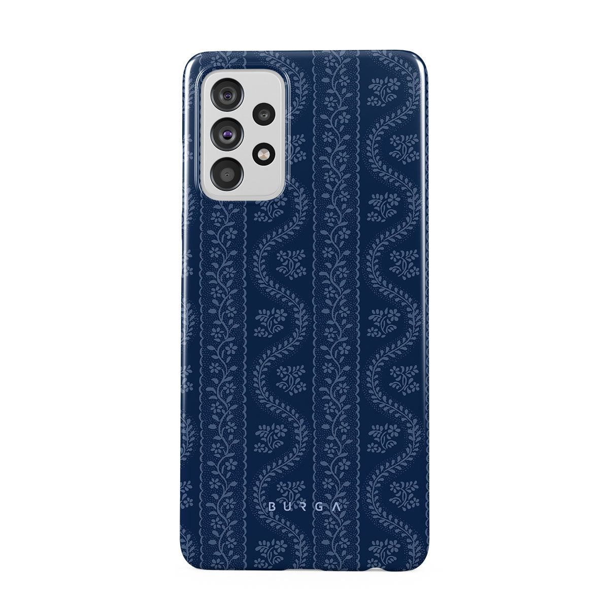 這款手機殼設計採用了佩斯里、仿牛仔布、復古懷舊、經典款式、繁複花紋和藍色系的印花。