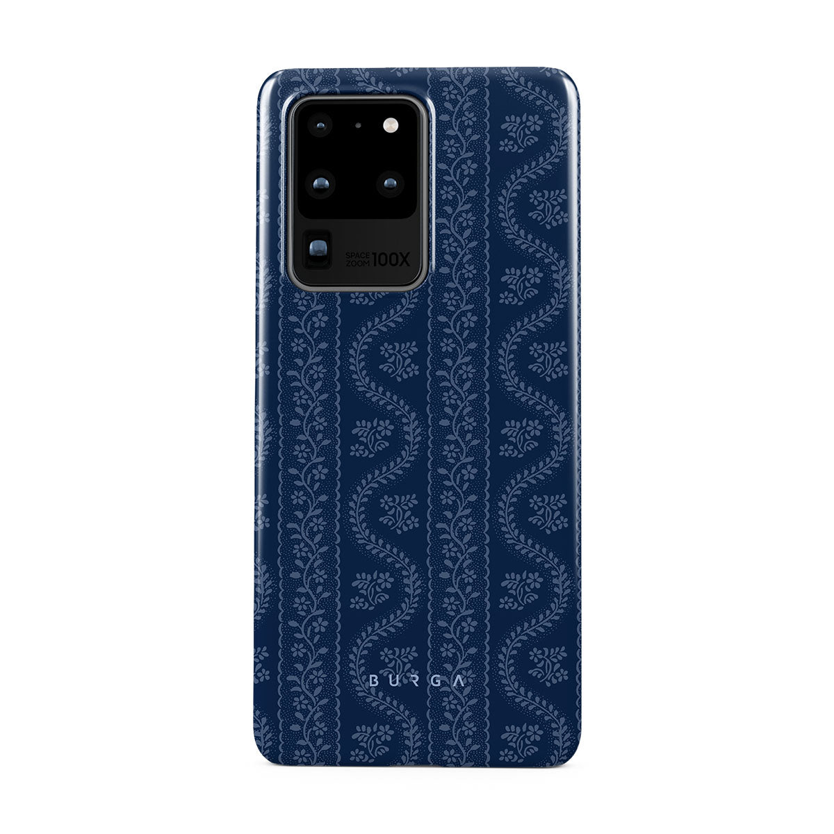這款手機殼設計採用了佩斯里、仿牛仔布、復古懷舊、經典款式、繁複花紋和藍色系的印花。