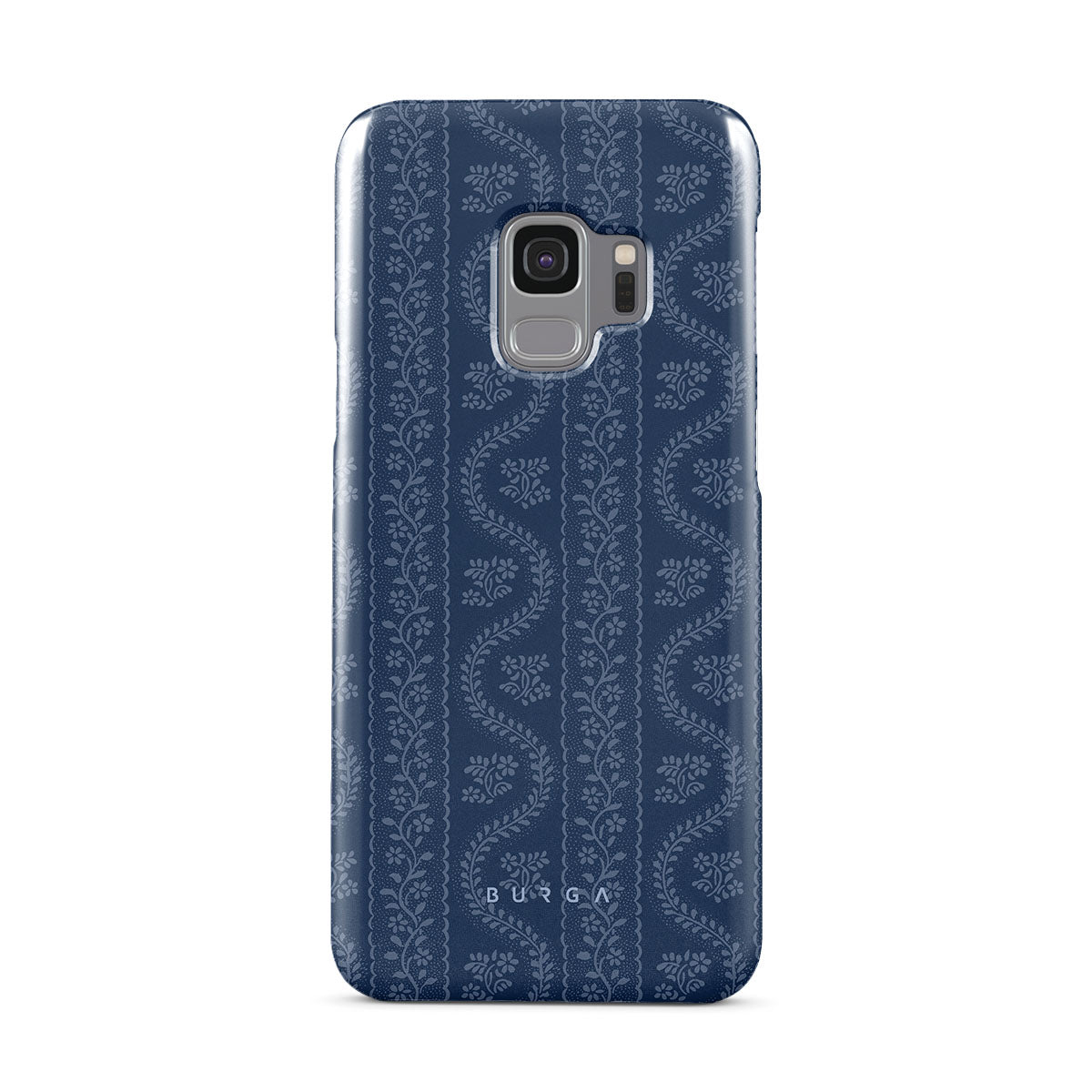 這款手機殼設計採用了佩斯里、仿牛仔布、復古懷舊、經典款式、繁複花紋和藍色系的印花。
