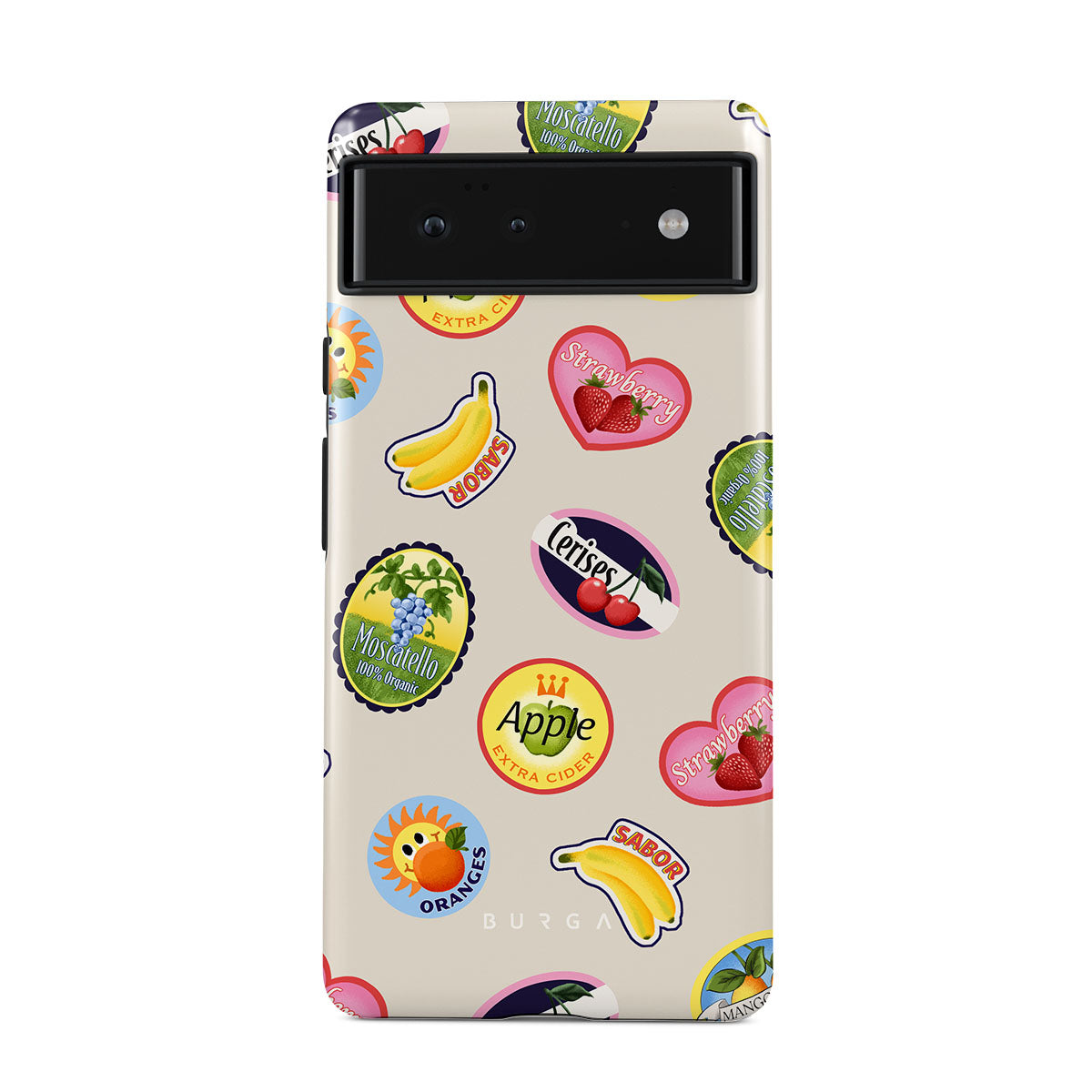 此設計特色:香蕉、郵票、櫻桃、蘋果、橙子、草莓、鮮豔色彩、柑橘色調、水果圖案、熱帶圖案