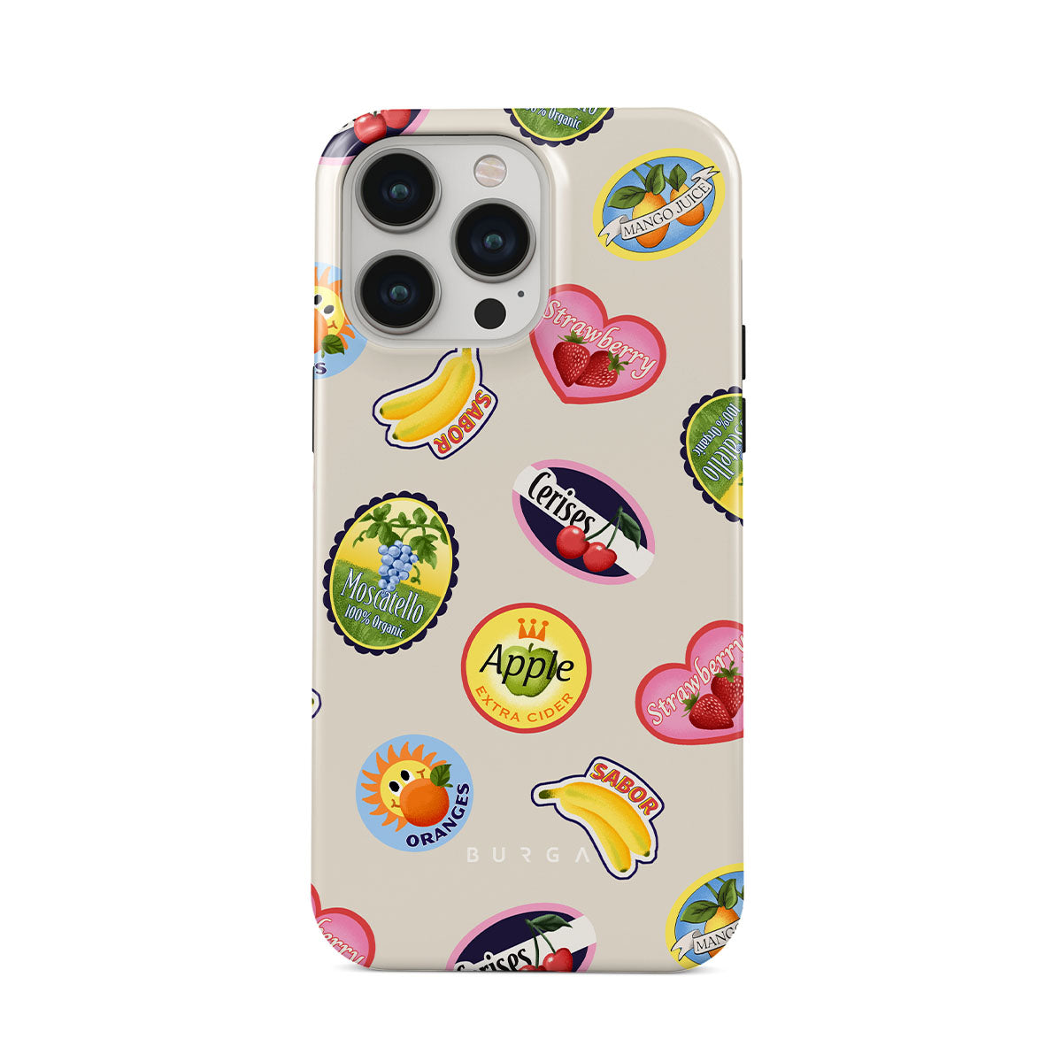 此設計特色:香蕉、郵票、櫻桃、蘋果、橙子、草莓、鮮豔色彩、柑橘色調、水果圖案、熱帶圖案