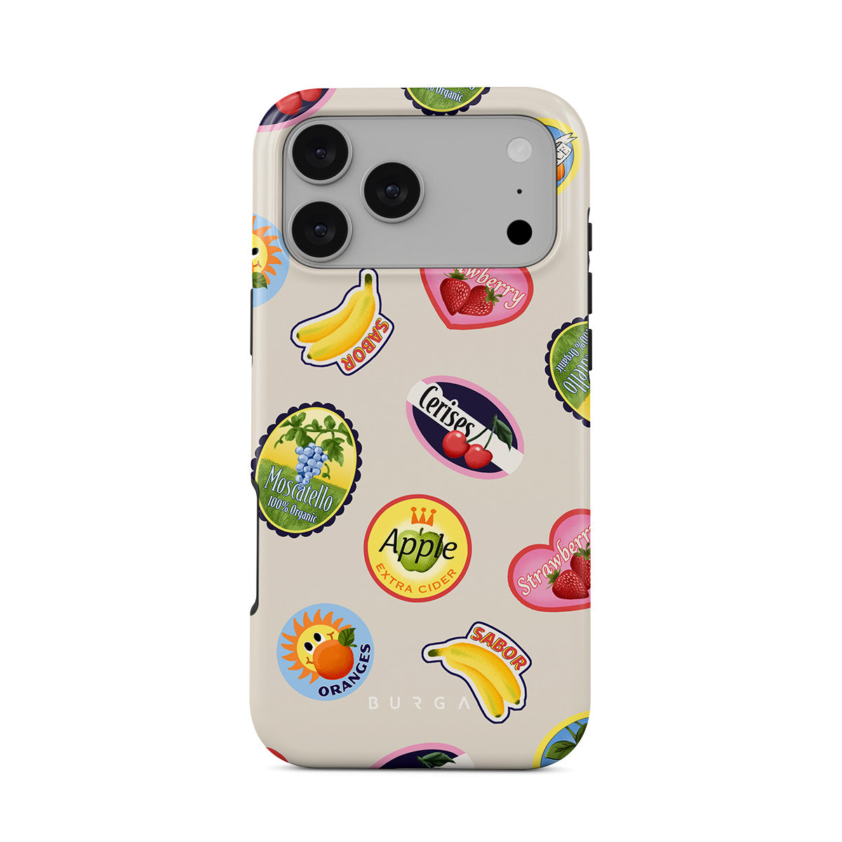 此設計特色:香蕉、郵票、櫻桃、蘋果、橙子、草莓、鮮豔色彩、柑橘色調、水果圖案、熱帶圖案
