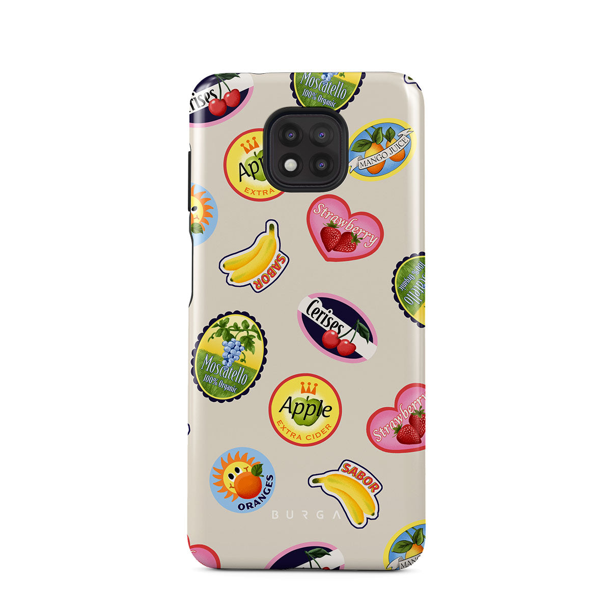 此設計特色:香蕉、郵票、櫻桃、蘋果、橙子、草莓、鮮豔色彩、柑橘色調、水果圖案、熱帶圖案