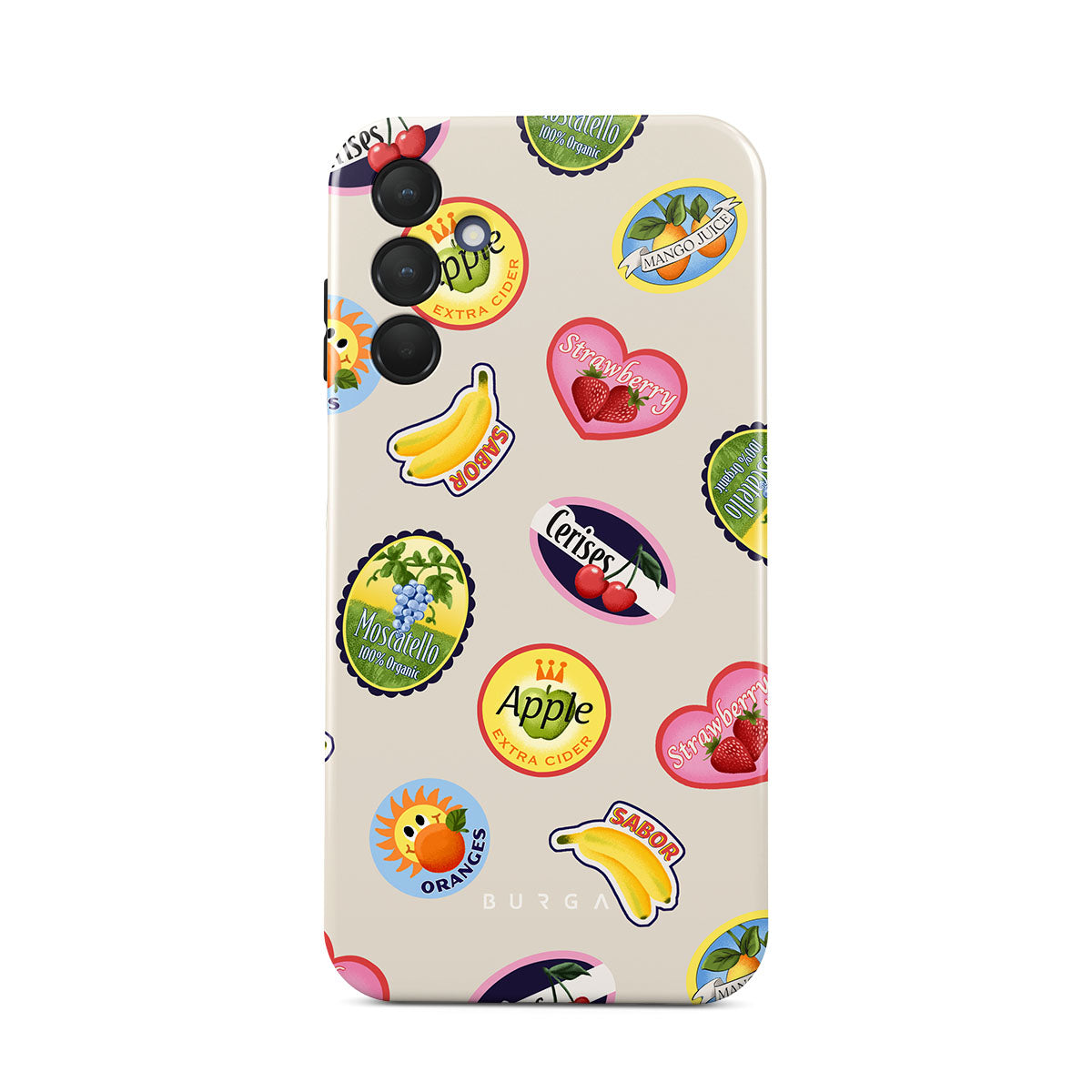 此設計特色:香蕉、郵票、櫻桃、蘋果、橙子、草莓、鮮豔色彩、柑橘色調、水果圖案、熱帶圖案