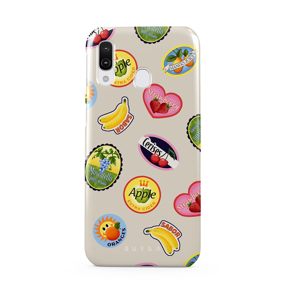 此設計特色:香蕉、郵票、櫻桃、蘋果、橙子、草莓、鮮豔色彩、柑橘色調、水果圖案、熱帶圖案