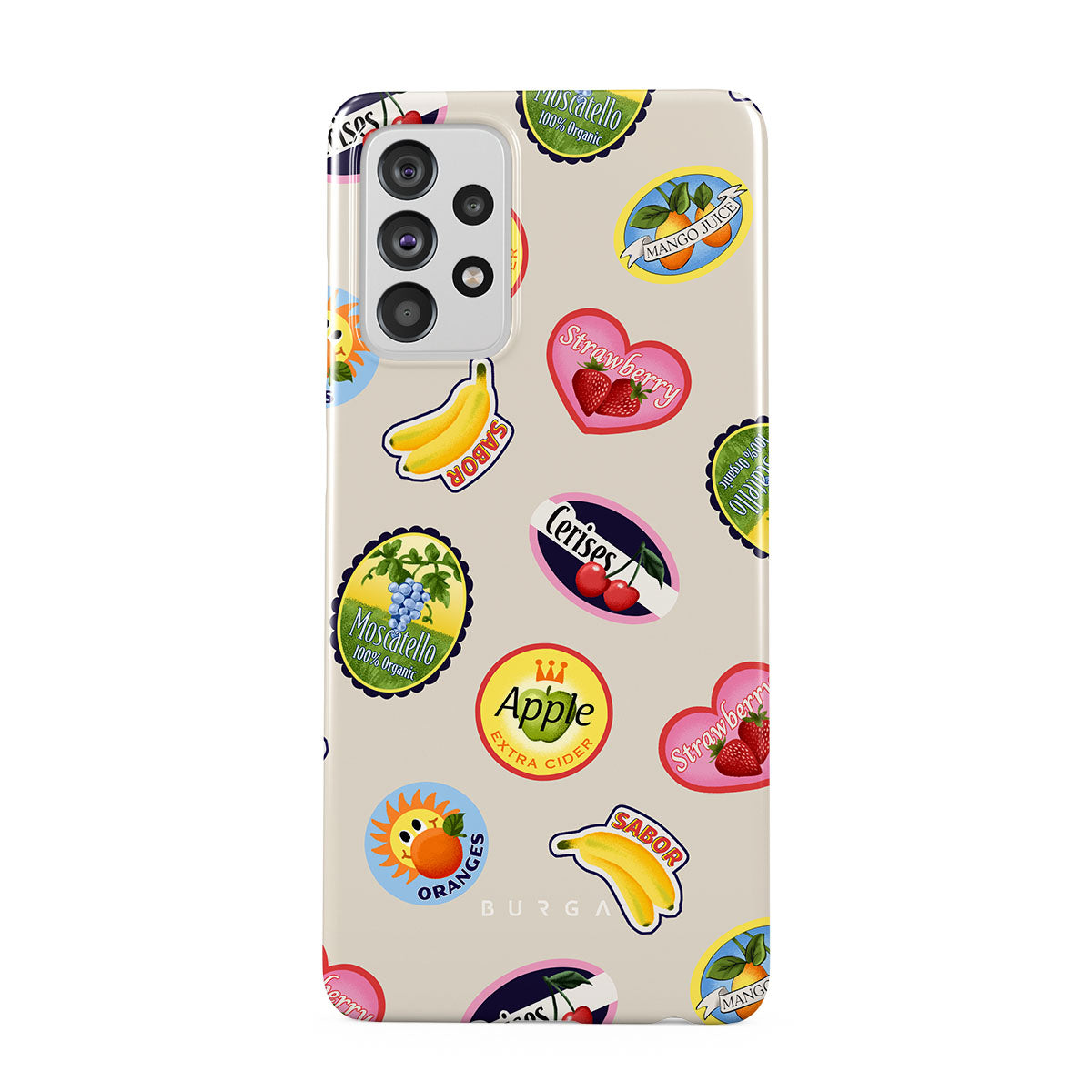 此設計特色:香蕉、郵票、櫻桃、蘋果、橙子、草莓、鮮豔色彩、柑橘色調、水果圖案、熱帶圖案
