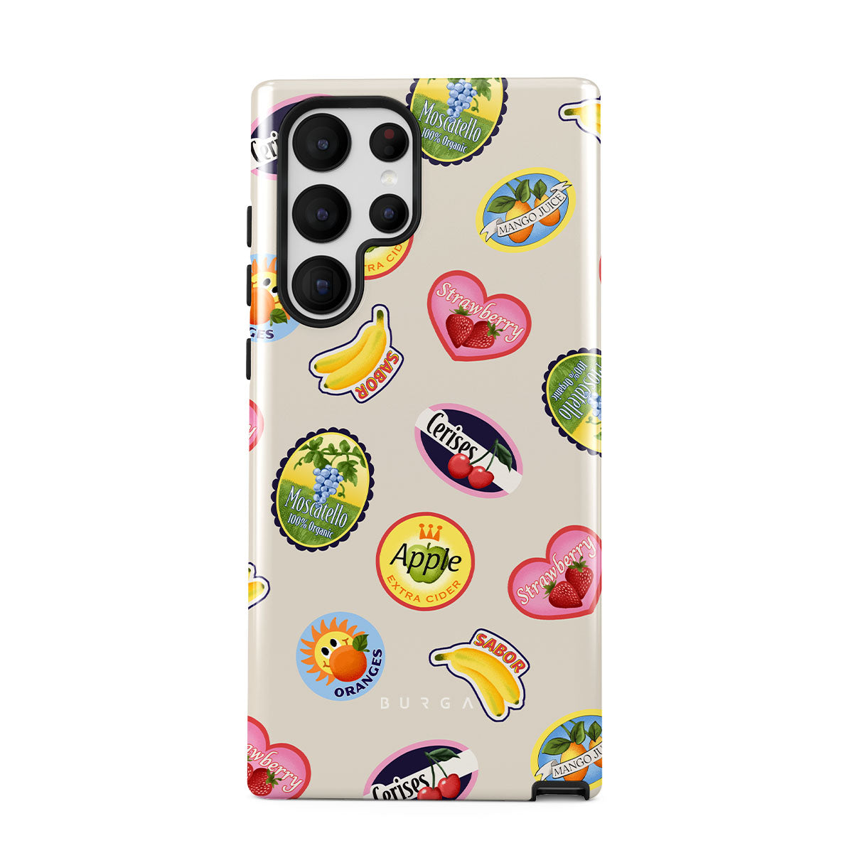 此設計特色:香蕉、郵票、櫻桃、蘋果、橙子、草莓、鮮豔色彩、柑橘色調、水果圖案、熱帶圖案