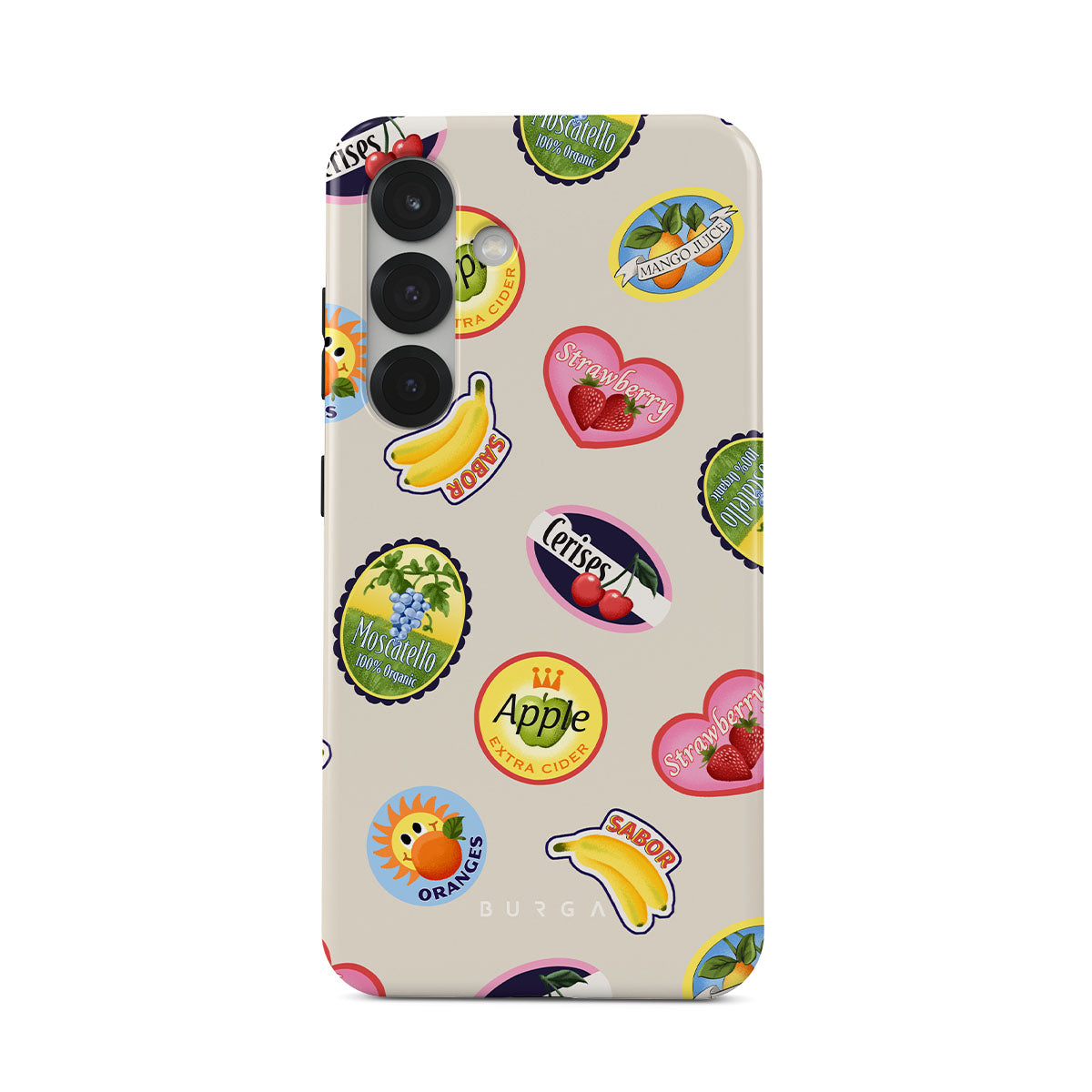 此設計特色:香蕉、郵票、櫻桃、蘋果、橙子、草莓、鮮豔色彩、柑橘色調、水果圖案、熱帶圖案