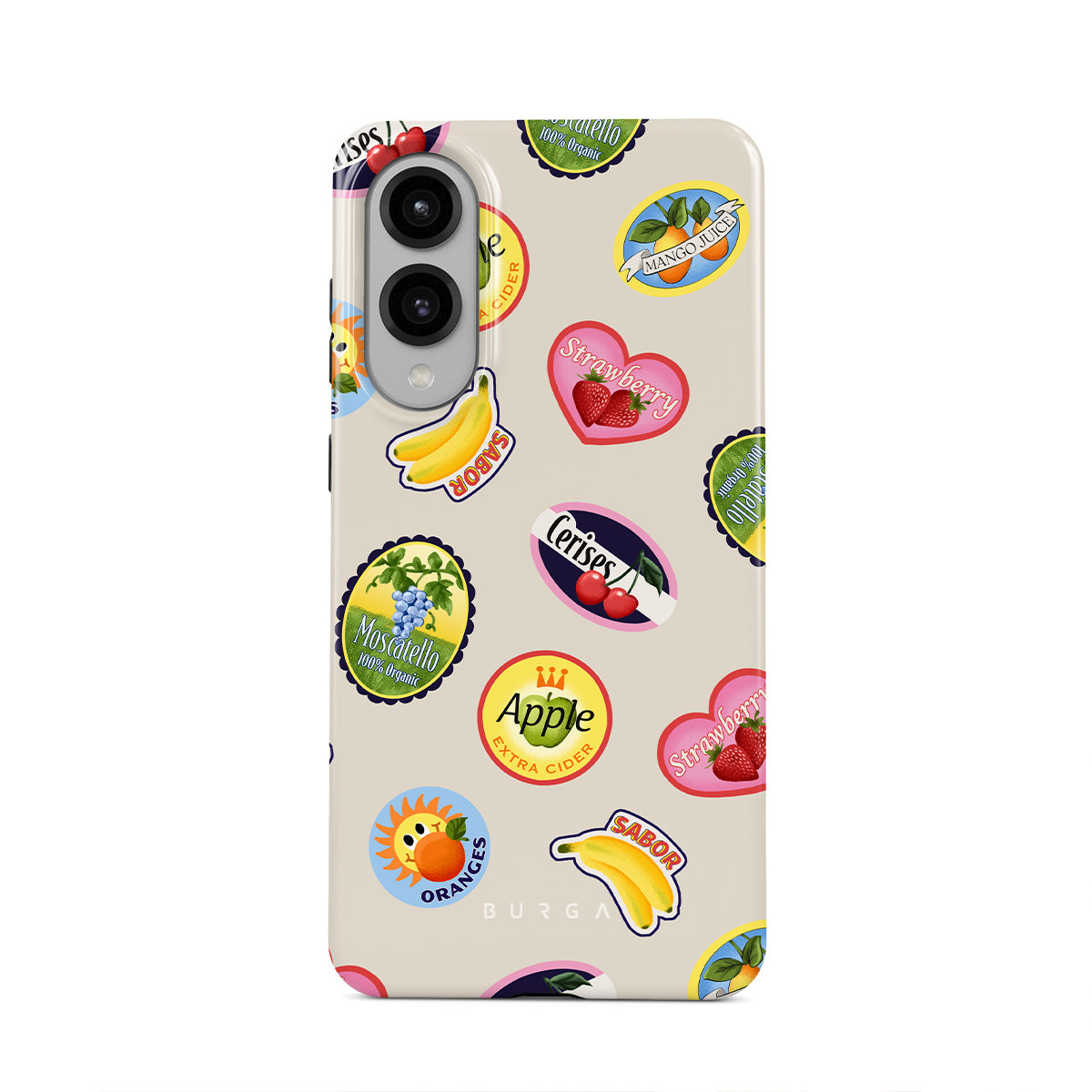 此設計特色:香蕉、郵票、櫻桃、蘋果、橙子、草莓、鮮豔色彩、柑橘色調、水果圖案、熱帶圖案