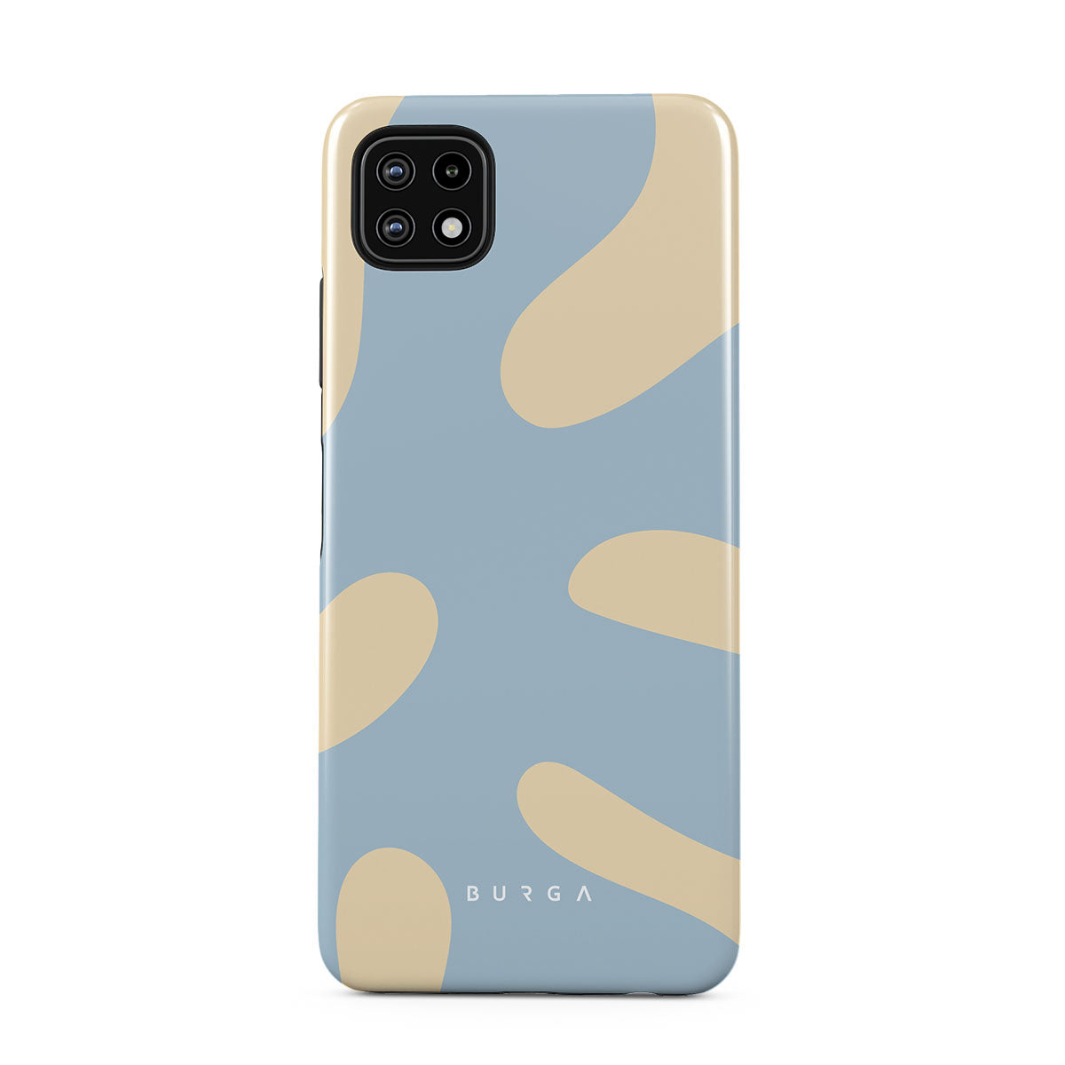 此設計特色:波浪,抽象圖案,淺藍色漩渦,奶油黃色漩渦.