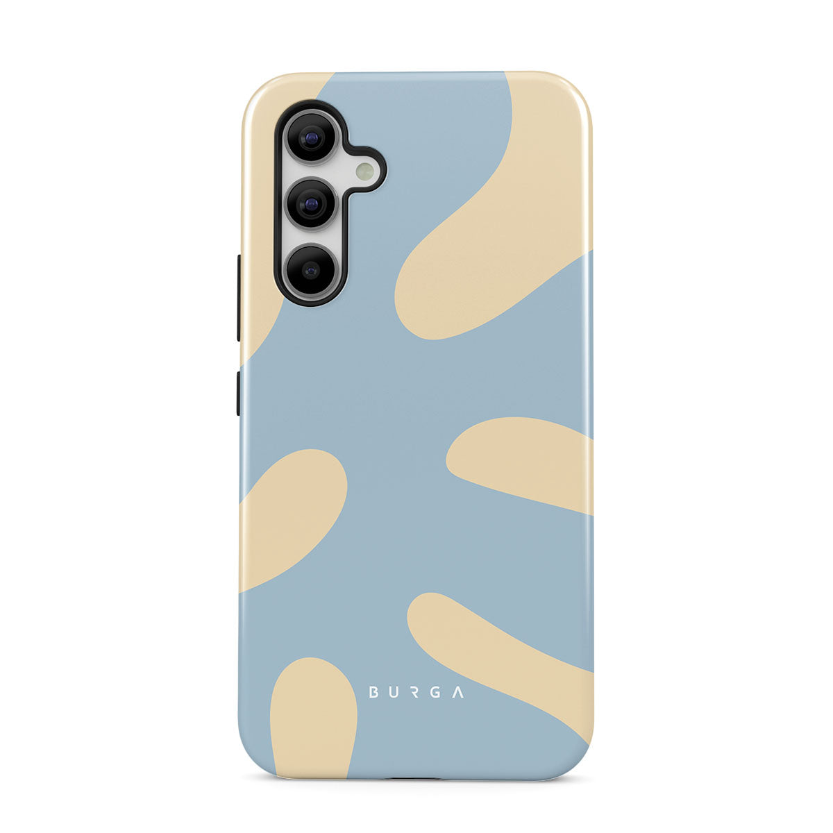此設計特色:波浪,抽象圖案,淺藍色漩渦,奶油黃色漩渦.