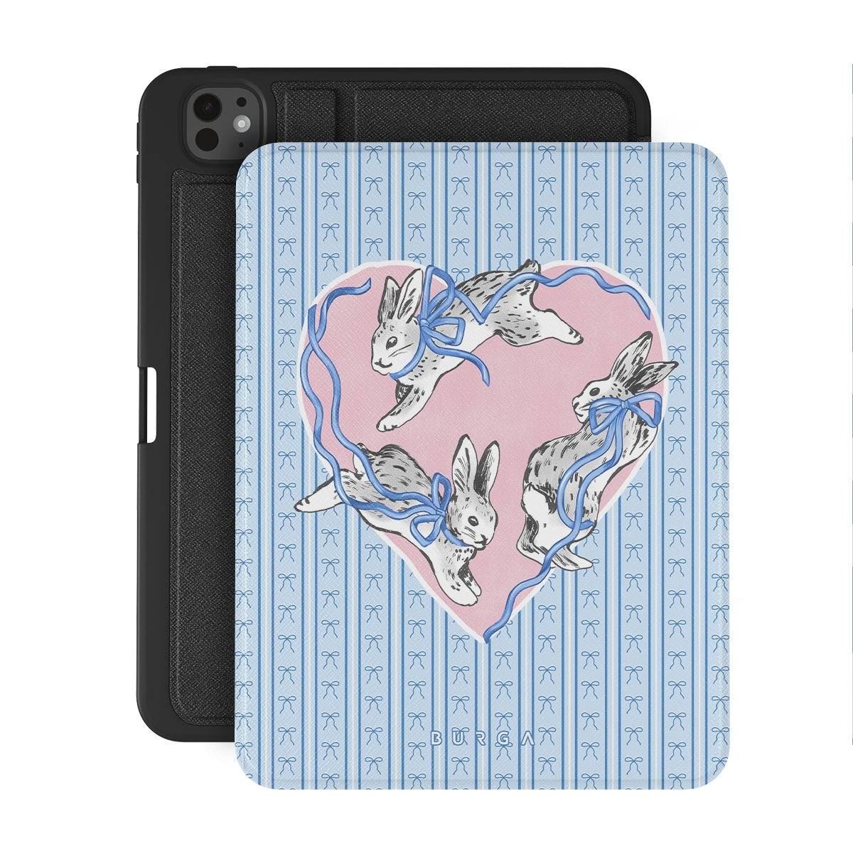 此設計特色: 白兔、心形相框、藍色條紋