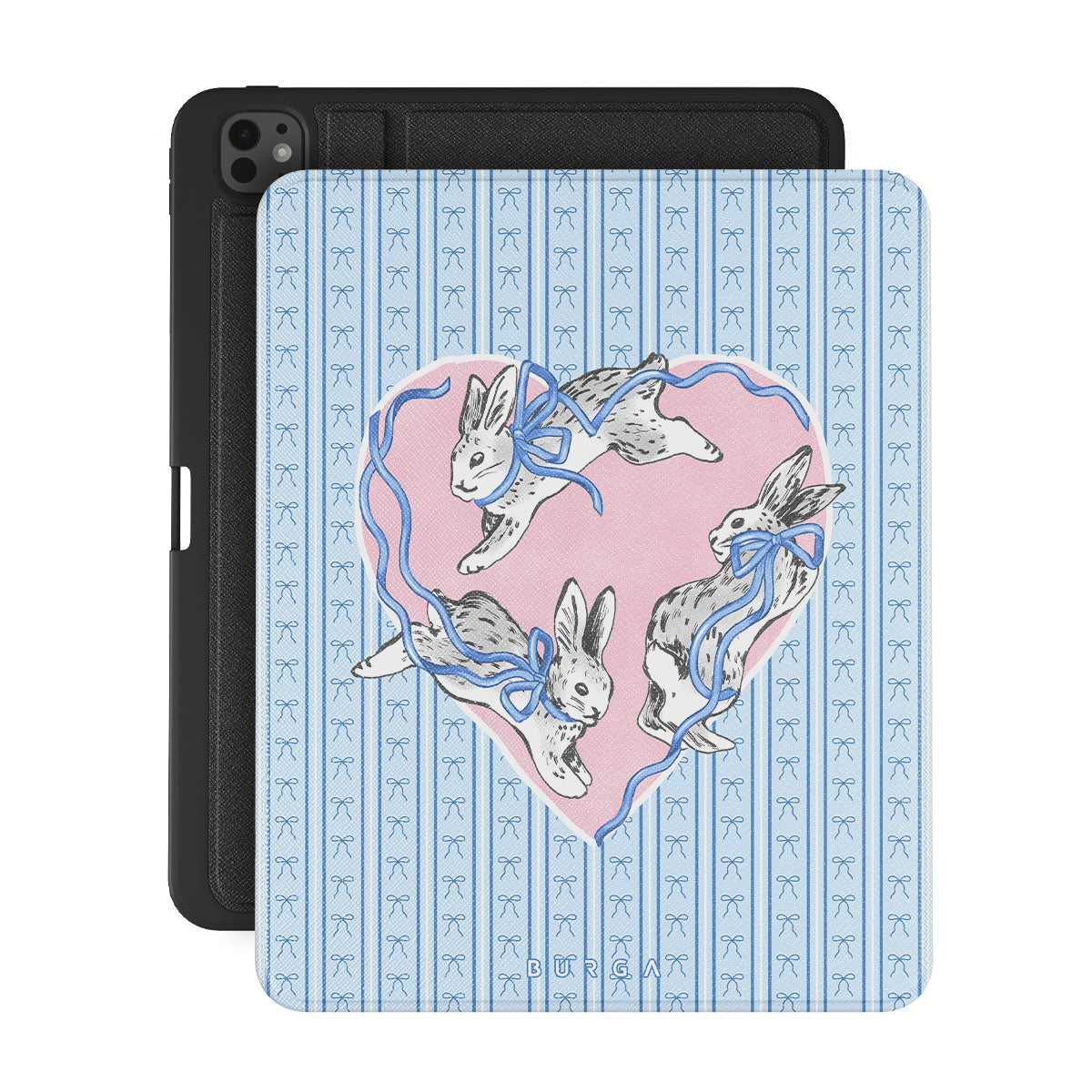 此設計特色: 白兔、心形相框、藍色條紋