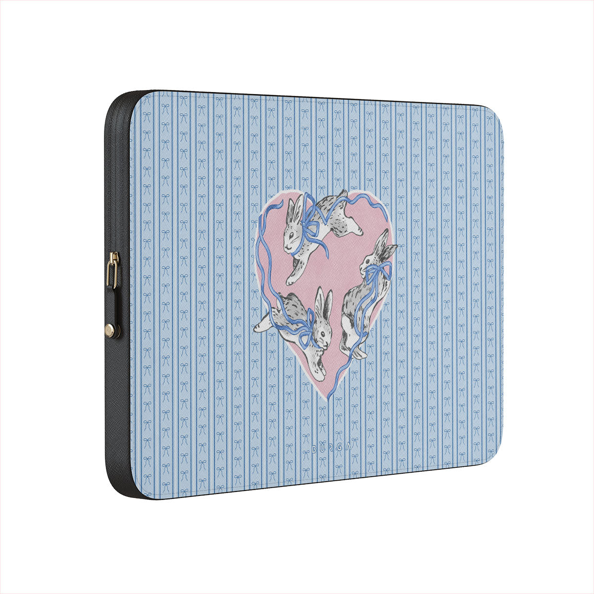 此設計特色: 白兔、心形相框、藍色條紋