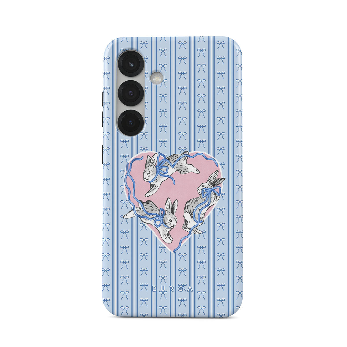 此設計特色: 白兔、心形相框、藍色條紋