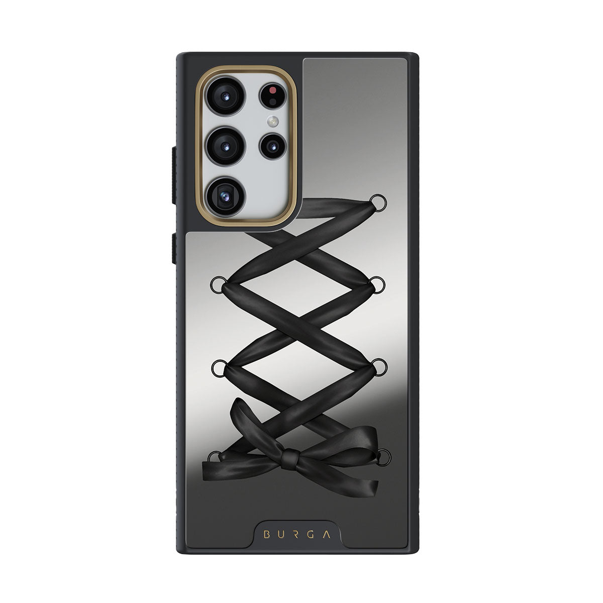 此設計包含:黑色絲帶、交叉圖案、鏡面效果。