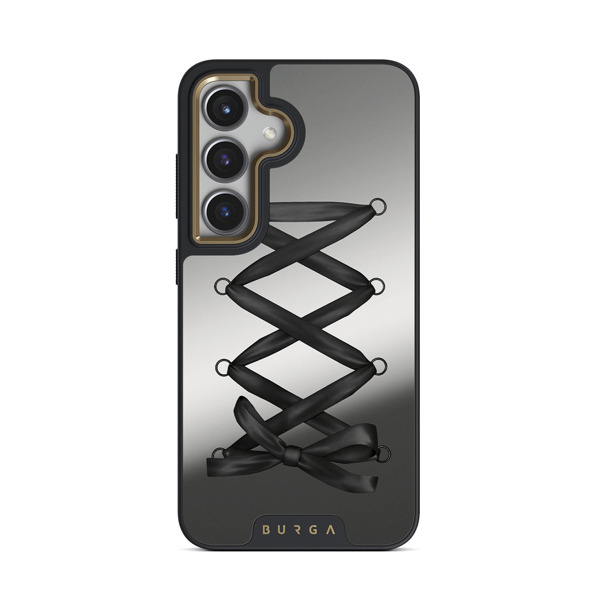 此設計包含:黑色絲帶、交叉圖案、鏡面效果。