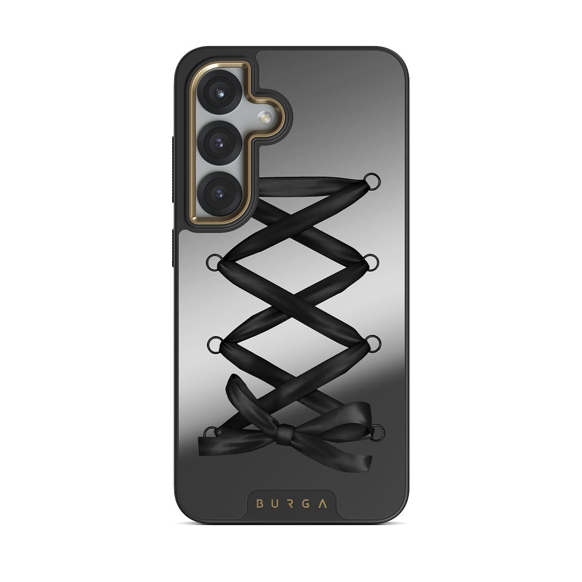 此設計包含:黑色絲帶、交叉圖案、鏡面效果。