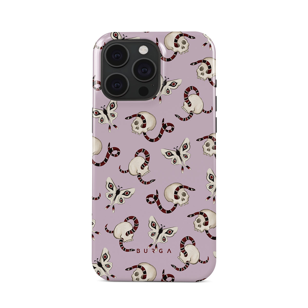 此設計特色:骷髏、花朵、蝴蝶、粉紅色背景