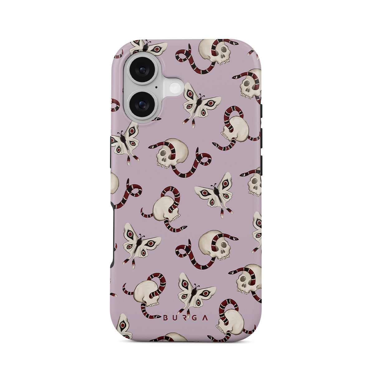 此設計特色:骷髏、花朵、蝴蝶、粉紅色背景
