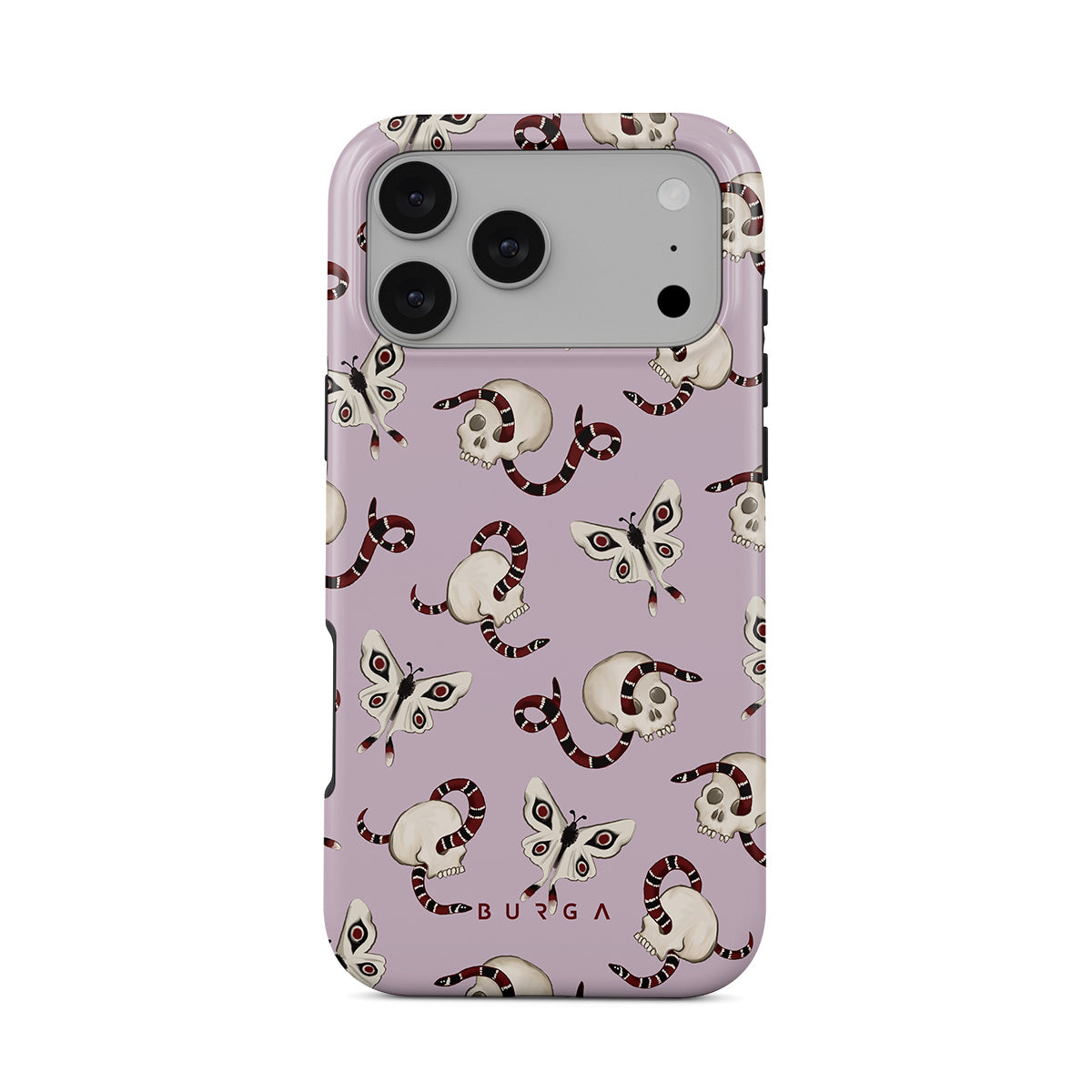 此設計特色:骷髏、花朵、蝴蝶、粉紅色背景