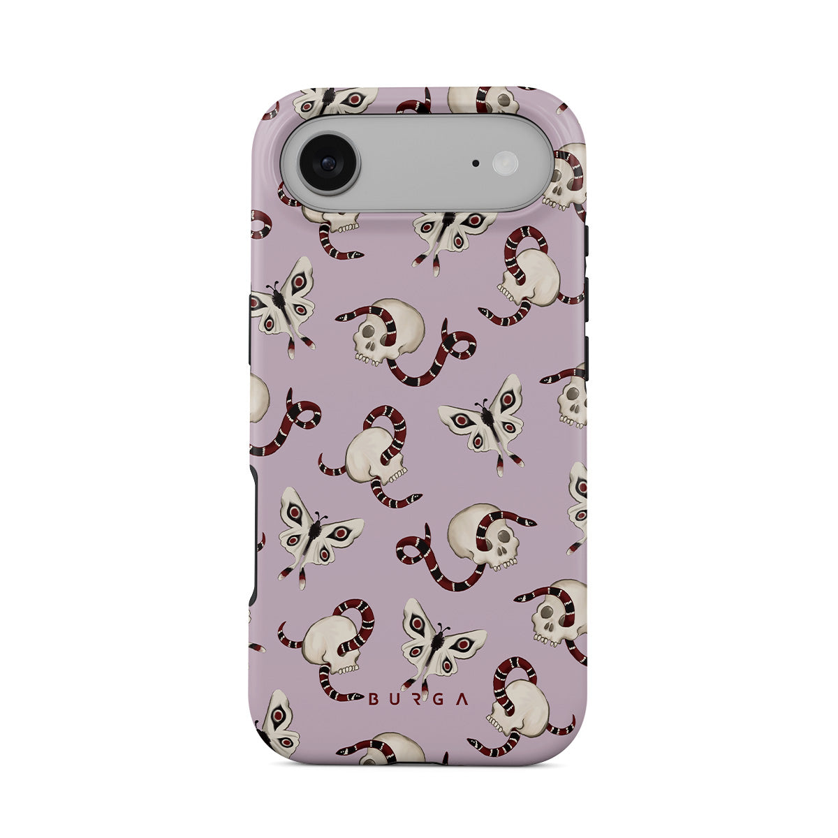 此設計特色:骷髏、花朵、蝴蝶、粉紅色背景