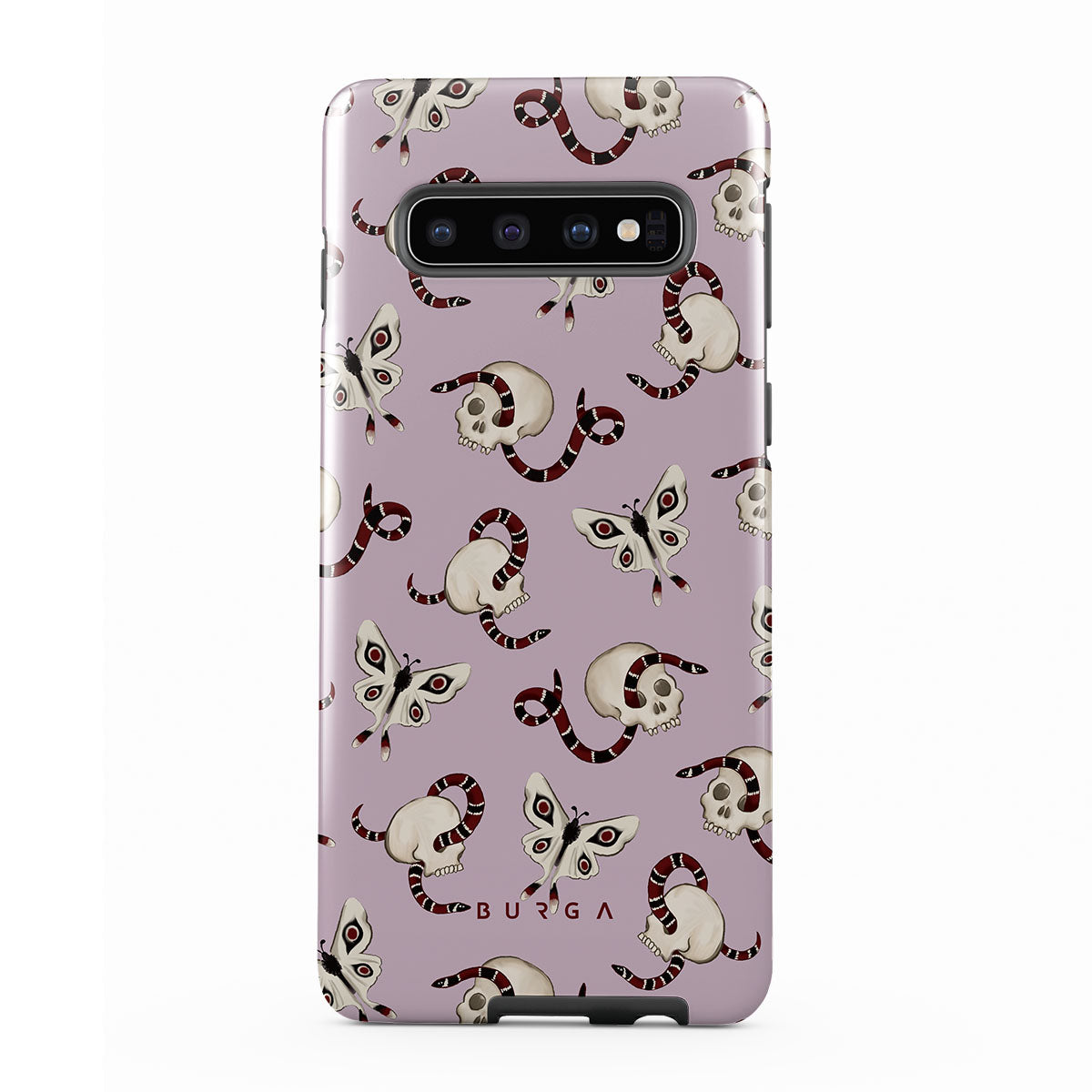 此設計特色:骷髏、花朵、蝴蝶、粉紅色背景